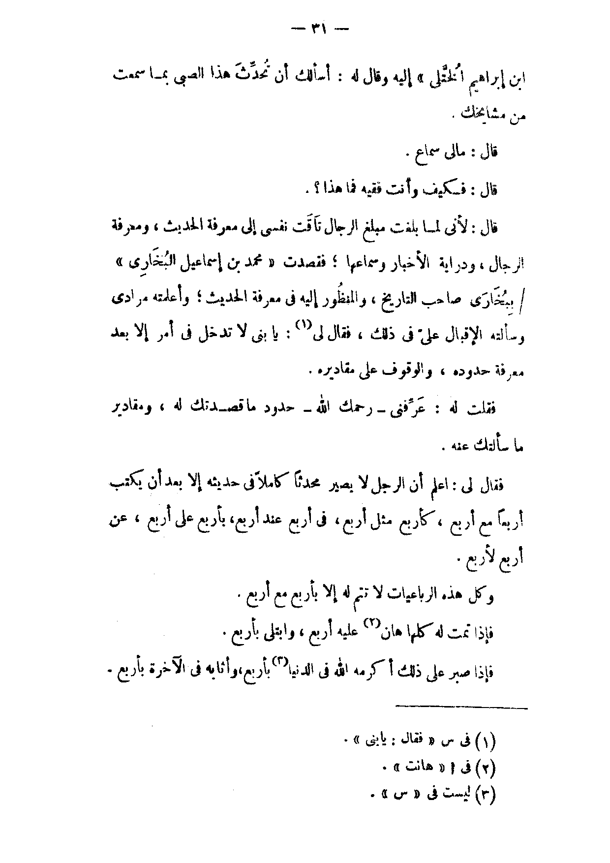 قَالَ لِأَنِّي لَمَّا بَلَغْتُ مَبْلَغَ الرِّجَالِ تَاقَتْ نَفْسِي إِلَى مَعْرِفَةِ الْحَدِيثِ وَمَعْرِفَةِ الرِّجَالِ وَدِرَايَةِ الْأَخْبَارِ وَسَمَاعِهَا فَقَصَدْتُ مُحَمَّدَ بْنَ إِسْمَاعِيلَ الْبُخَارِيَّ بِبُخَارَى صَاحِبَ التَّارِيخِ وَالْمَنْظُورَ إِلَيْهِ فِي مَعْرِفَةِ الْحَدِيثِ وَأَعْلَمْتُهُ مُرَادِي وَسَأَلْتُهُ الْإِقْبَالَ عَلَيَّ فِي ذَلِكَ فَقَالَ لِي يَا بُنَيَّ لَا تَدْخُلْ فِي أَمْرٍ إِلَّا بَعْدَ مَعْرِفَةِ حُدُودِهِ وَالْوُقُوفِ عَلَى مَقَادِيرِهِ