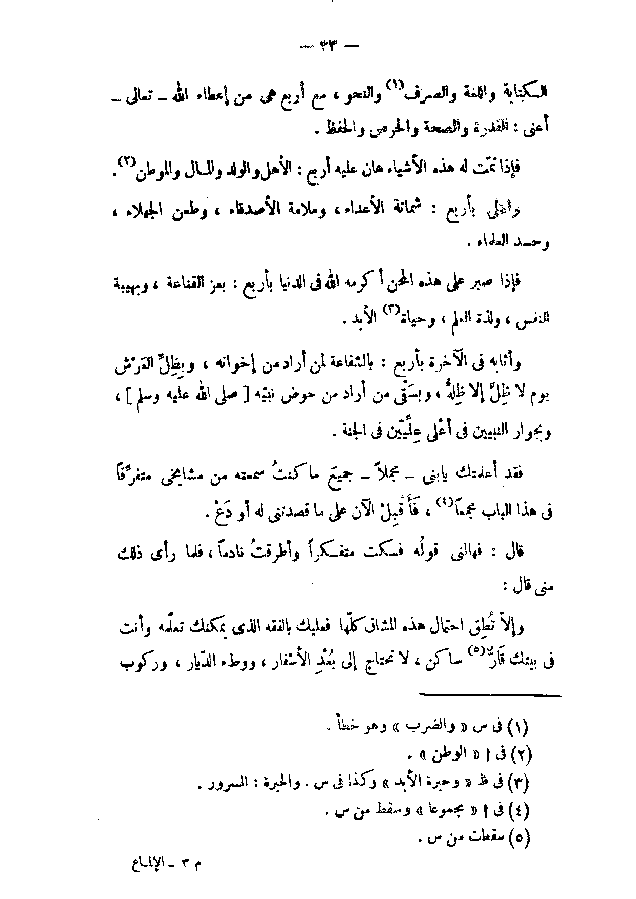 فَإِذَا تَمَّتْ لَهُ هَذِهِ الْأَشْيَاءُ هَانَ عَلَيْهِ أَرْبَعٌ الْأَهْلُ وَالْوَلَدُ وَالْمَالُ وَالْمَوْطِنُ وَابْتُلِيَ بِأَرْبَعٍ شَمَاتَةِ الْأَعْدَاءِ وَمَلَامَةِ الْأَصْدِقَاءِ وَطَعْنِ الْجُهَلَاءِ وَحَسَدِ الْعُلَمَاءِ