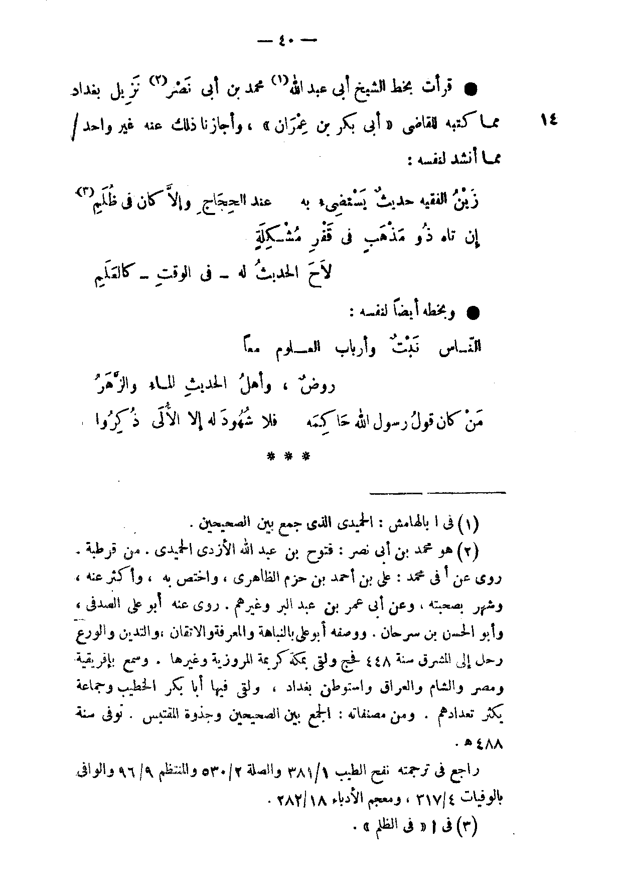 قَرَأْتُ بِخَطِّ الشَّيْخِ أَبِي عَبْدِ اللَّهِ مُحَمَّدِ بْنِ أَبِي نَصْرٍ نَزِيلِ بَغْدَادَ مِمَّا كَتَبَهُ لِلْقَاضِي أَبِي بَكْرِ بْنِ عِمْرَانَ وَأَجَازَنَا ذَلِكَ عَنْهُ غَيْرُ وَاحِدٍ مِمَّا أَنْشَدَ لِنَفْسِهِ