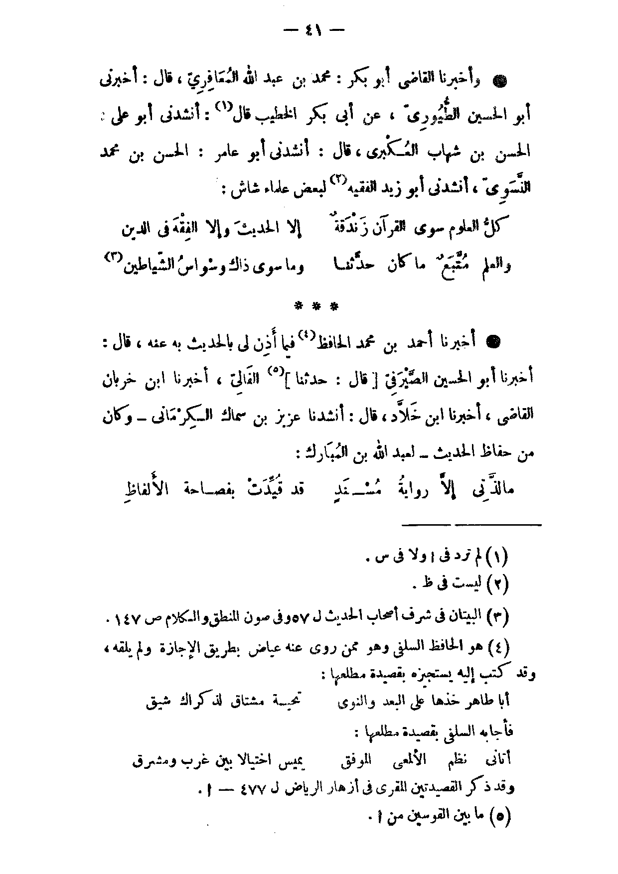 وَأَخْبَرَنَا الْقَاضِي أَبُو بَكْرٍ مُحَمَّدُ بْنُ عَبْدِ اللَّهِ الْمَعَافِرِيُّ قَالَ أَخْبَرَنِي أَبُو الْحُسَيْنِ الطُّيُورِيُّ عَنْ أَبِي بَكْرٍ الْخَطِيبِ قَالَ أَنْشَدَنِي أَبُو عَلِيٍّ الْحَسَنُ بْنُ شِهَابٍ الْعُكْبَرِيُّ قَالَ أَنْشَدَنِي أَبُو عَامِرٍ الْحَسَنُ بْنُ مُحَمَّدٍ النَّسَوِيُّ أَنْشَدَنِي أَبُو زَيْدٍ الْفَقِيهُ لِبَعْضِ عُلَمَاءِ شَاشٍ