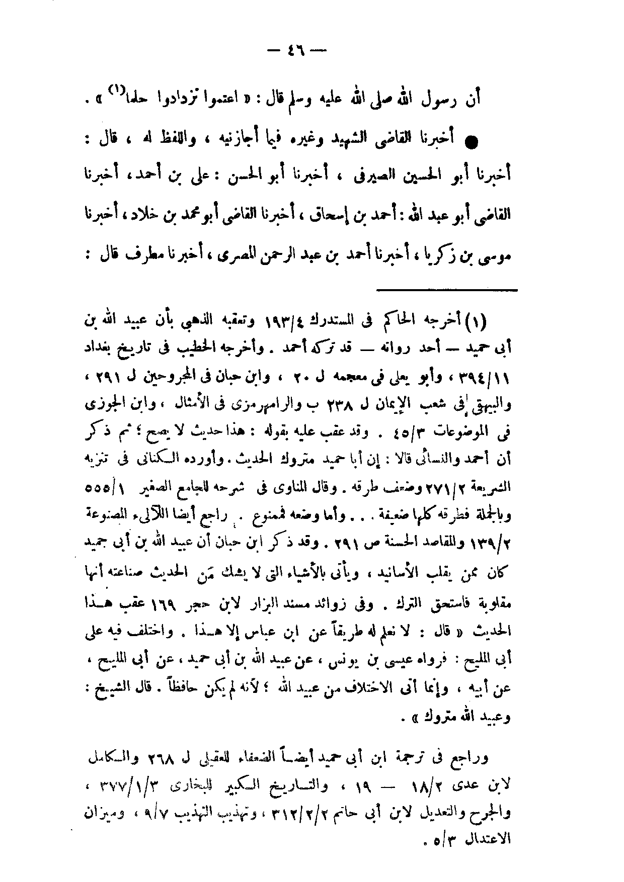 أَخْبَرَنَا الْقَاضِي الشَّهِيدُ وَغَيْرُهُ فِيمَا أَجَازَنِيهُ وَاللَّفْظُ لَهُ قَالَ أَخْبَرَنَا أَبُو الْحُسَيْنِ الصَّيْرَفِيُّ أَخْبَرَنَا أَبُو الْحَسَنِ عَلِيُّ بْنُ أَحْمَدَ أَخْبَرَنَا الْقَاضِي أَبُو عَبْدِ اللَّهِ أَحْمَدُ بْنُ إِسْحَاقَ أَخْبَرَنَا الْقَاضِي أَبُو مُحَمَّدِ بْنُ خَلَّادٍ أَخْبَرَنَا مُوسَى بْنُ زَكَرِيَّا أَخْبَرَنَا أَحْمَدُ بْنُ عَبْدِ الرَّحْمَنِ الْمِصْرِيُّ أَخْبَرَنَا مُطَرِّفٌ قَالَ