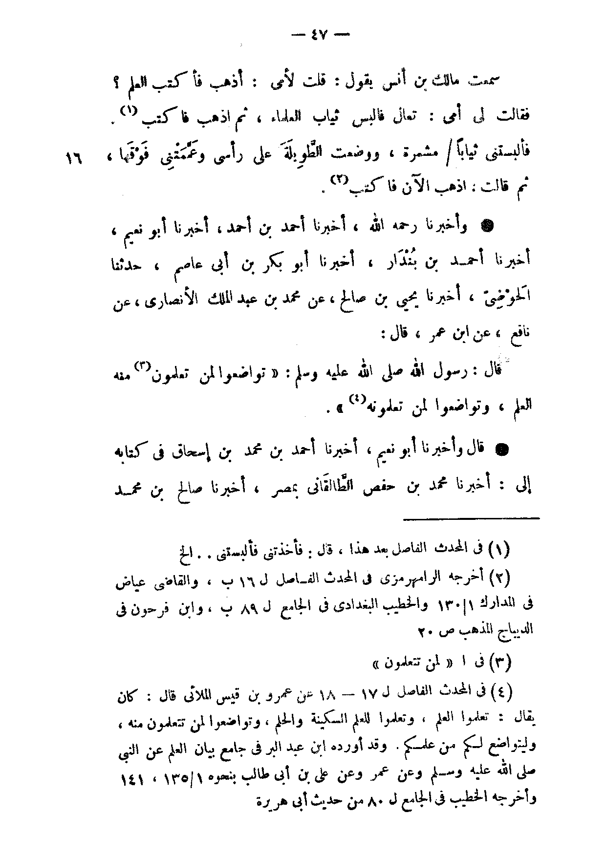 سَمِعْتُ مَالِكَ بْنَ أَنَسٍ يَقُولُ قُلْتُ لِأُمِّي أَذْهَبُ فَأَكْتُبُ الْعِلْمَ فَقَالَتْ لِي أُمِّي تَعَالَ فَالْبَسْ ثِيَابَ الْعُلَمَاءِ ثُمَّ اذْهَبْ فَاكْتُبْ فَأَلْبَسَتْنِي ثِيَابًا مُشَمَّرَةً وَوَضَعَتِ الطَّوِيلَةَ عَلَى رَأْسِي وَعَمَّمَتْنِي فَوْقَهَا ثُمَّ قَالَتْ اذْهَبِ الْآنَ فَاكْتُبْ