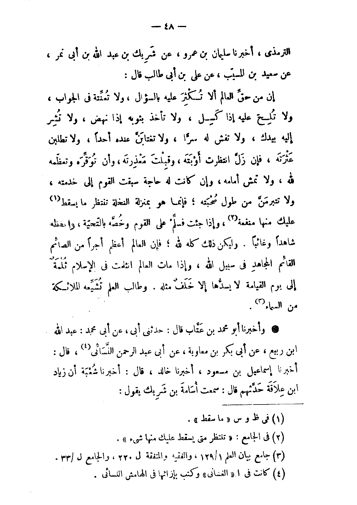 إِنَّ مِنْ حَقِّ الْعَالِمِ أَلَّا تُكْثِرَ عَلَيْهِ بِالسُّؤَالِ وَلَا تُعَنِّتَهُ فِي الْجَوَابِ وَلَا تُلِحَّ عَلَيْهِ إِذَا كَسِلَ وَلَا تَأْخُذْ بِثَوْبِهِ إِذَا نَهَضَ وَلَا تُشِرْ إِلَيْهِ بِيَدِكَ وَلَا تُفْشِ لَهُ سِرًّا وَلَا تَغْتَابَنَّ عِنْدَهُ أَحَدًا وَلَا تَطْلُبَنَّ عَثْرَتَهُ فَإِنْ زَلَّ انْتَظَرْتَ أَوْبَتَهُ وَقَبِلْتَ مَعْذِرَتَهِ وَأَنْ تُوَقِّرَهُ وَتُعَظِّمَهُ لِلَّهِ وَلَا تَمْشِ أَمَامَهُ وَإِنْ كَانَتْ لَهُ حَاجَةٌ سَبَقْتَ الْقَوْمَ إِلَى خِدْمَتِهِ وَلَا تَتَبَرَّمَنَّ مِنْ طُولِ صُحْبَتِهِ فَإِنَّمَا هُوَ بِمَنْزِلَةِ النَّخْلَةِ تَنْتَظِرُ مَا يَسْقُطُ عَلَيْكَ مِنْهَا مَنْفَعَةً وَإِذَا جِئْتَ فَسَلِّمْ عَلَى الْقَوْمِ وَخُصَّهُ بِالتَّحِيَّةِ وَاحْفَظْهُ شَاهِدًا وَغَائِبًا وَلِيَكُنْ ذَلِكَ كُلُّهُ لِلَّهِ فَإِنَّ الْعَالِمَ أَعْظَمُ أَجْرًا مِنَ الصَّائِمِ الْقَائِمِ الْمُجَاهِدِ فِي سَبِيلِ الله وَإِذا مَاتَ الْعَالم ان انْثَلَمَتْ فِي الْإِسْلَامِ ثُلْمَةٌ إِلَى يَوْمِ الْقِيَامَةِ لَا يَسِدُّهَا إِلَّا خَلَفٌ مِثْلُهُ وَطَالِبُ الْعِلْمِ تُشَيِّعُهُ الْمَلَائِكَةُ مِنَ السَّمَاءِ