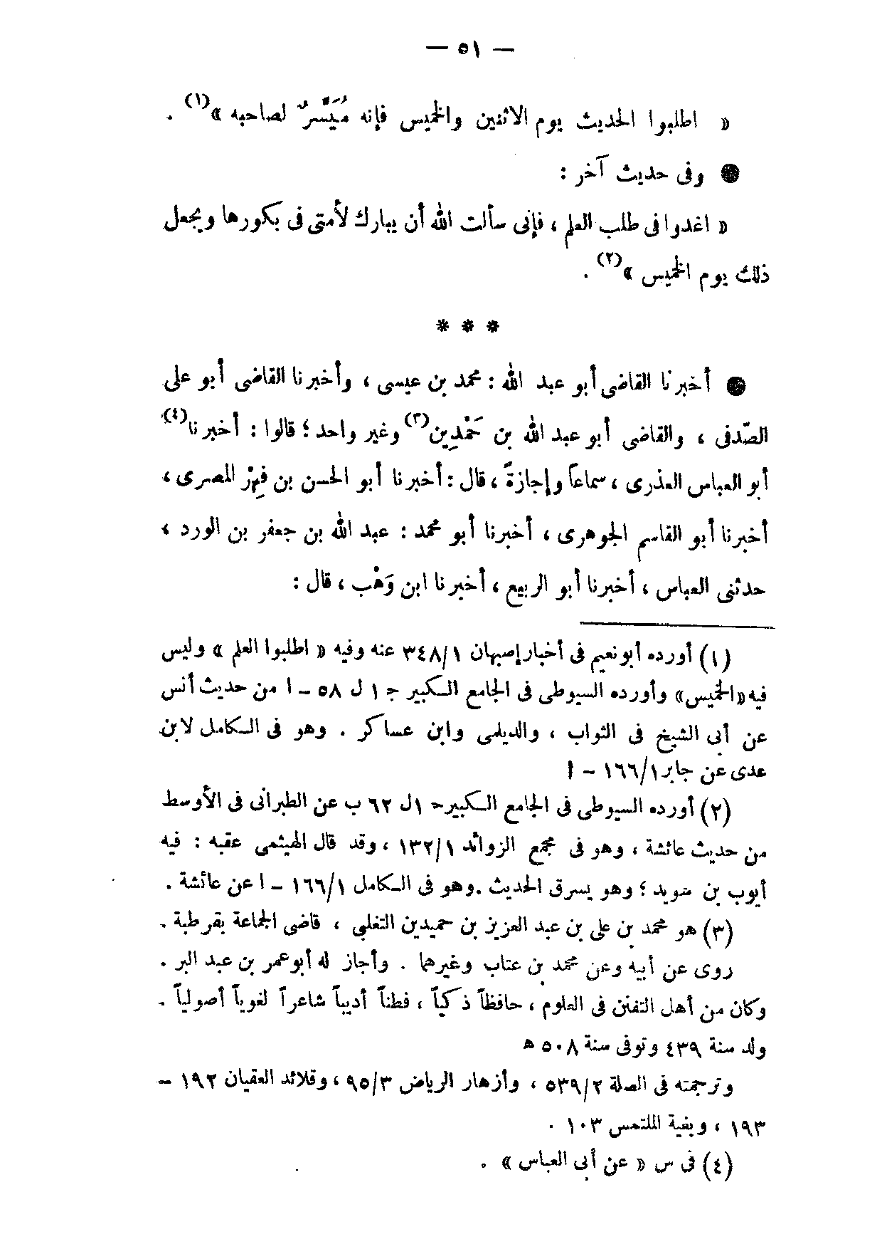 اطْلُبُوا الْحَدِيثَ يَوْمَ الِاثْنَيْنِ وَالْخَمِيسِ فَإِنَّهُ مُيَسَّرٌ لِصَاحِبِهِ