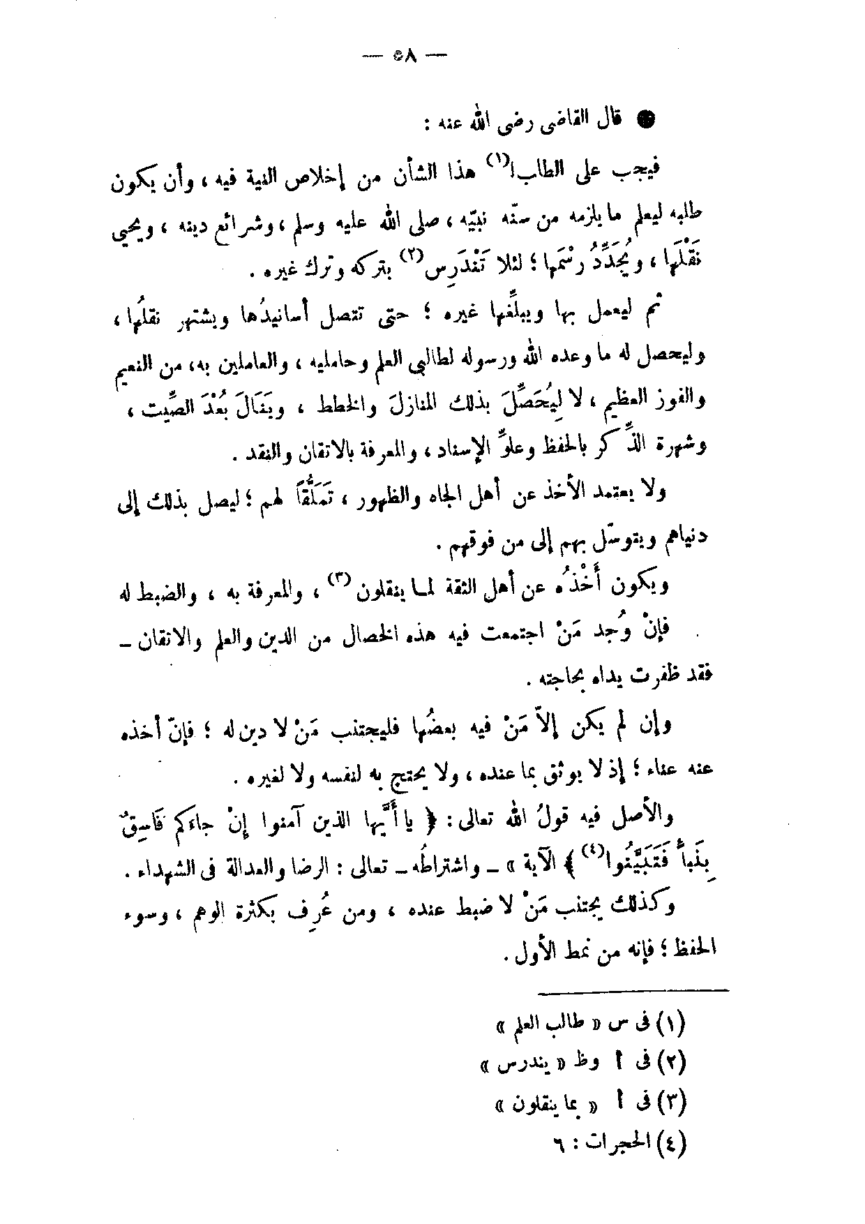 فَيجب على الطَّالِب ل هَذَا الشَّأْنِ مِنْ إِخْلَاصِ النِّيَّةِ فِيهِ وَأَنْ يَكُونَ طَلَبُهُ لِيَعْلَمَ مَا يَلْزَمُهُ مِنْ سُنَّةِ نَبِيِّهِ صَلَّى اللَّهُ عَلَيْهِ وَسَلَّمَ وَشَرَائِعِ دِينِهِ وَيُحْيِي نَقْلَهَا وَيُجَدِّدُ رَسْمَهَا لِئَلَّا تَنْدَرِسَ بِتَرْكِهِ وَتَرْكِ غَيْرِهِ
