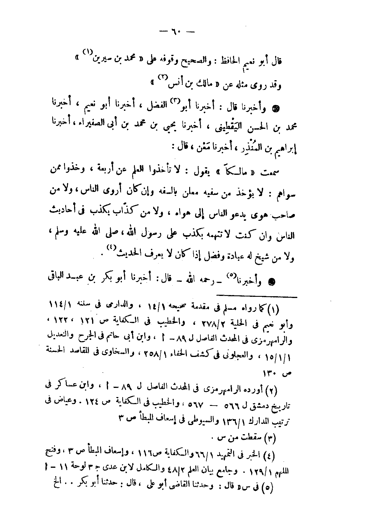 سَمِعْتُ مَالِكًا يَقُولُ لَا تَأْخُذُوا الْعِلْمَ عَنْ أَرْبَعَةٍ وَخُذُوا مِمَّنْ سِوَاهُمْ لَا يُؤْخَذُ مِنْ سَفِيهٍ مُعْلِنٍ بِالسَّفَهِ وَإِنْ كَانَ أَرْوَى النَّاسِ وَلَا مِنْ صَاحِبِ هَوًى يَدْعُو النَّاسَ إِلَى هَوَاهُ وَلَا مِنْ كَذَّابٍ يَكْذِبُ فِي أَحَادِيثِ النَّاسِ وَإِنْ كُنْتَ لَا تَتَّهِمُهُ بِكَذِبٍ عَلَى رَسُولِ اللَّهِ صَلَّى اللَّهُ عَلَيْهِ وَسَلَّمَ وَلَا مِنْ شَيْخٍ لَهُ عِبَادَةٌ وَفَضْلٌ إِذَا كَانَ لَا يَعْرِفُ الْحَدِيثَ
