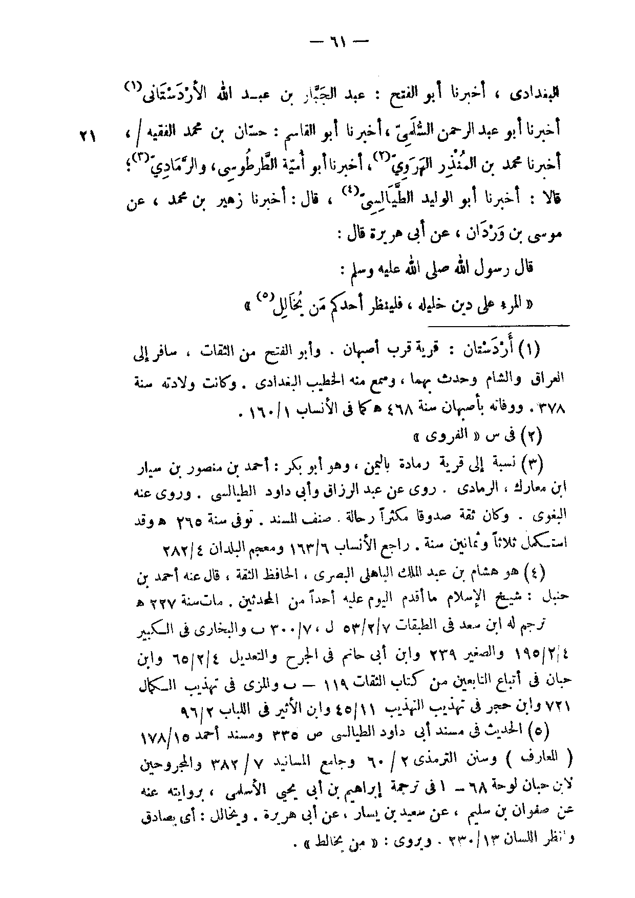 الْبَغْدَادِيُّ أَخْبَرَنَا أَبُو الْفَتْحِ عَبْدُ الْجَبَّارِ بْنُ عَبْدِ اللَّهِ الْأَرْدَسْتَانِيُّ أَخْبَرَنَا أَبُو عَبْدِ الرَّحْمَنِ السُّلَمِيُّ أَخْبَرَنَا أَبُو الْقَاسِمِ حَسَّانُ بْنُ مُحَمَّدٍ الْفَقِيهُ أَخْبَرَنَا مُحَمَّدُ بْنُ الْمُنْذِرِ الْهَرَوِيُّ أَخْبَرَنَا أَبُو أُمَيَّةَ الطَّرْطُوسِيُّ وَالرَّمَادِيُّ قَالَا أَخْبَرَنَا أَبُو الْوَلِيدِ الطَّيَالِسِيُّ قَالَ أَخْبَرَنَا زُهَيْرُ بْنُ مُحَمَّدٍ عَنْ مُوسَى بْنِ وَرْدَانَ عَنْ أَبِي هُرَيْرَةَ قَالَ