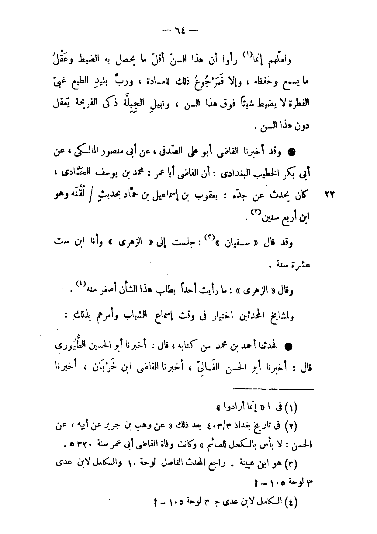 وَقَدْ أَخْبَرَنَا الْقَاضِي أَبُو عَلِيٍّ الصَّدَفِيُّ عَنْ أَبِي مَنْصُورٍ الْمَالِكِيِّ عَنْ أَبِي بَكْرٍ الْخَطِيبِ الْبَغْدَادِيِّ أَنَّ الْقَاضِي أَبَا عُمَرَ مُحَمَّدَ بْنَ يُوسُفَ الْحَمَّادِيَّ كَانَ يُحَدِّثُ عَنْ جَدِّهِ يَعْقُوبَ بْنِ إِسْمَاعِيلَ بْنِ حَمَّادٍ بِحَدِيثٍ لُقِّنَهُ وَهُوَ ابْنُ أَرْبَعِ سِنِينَ