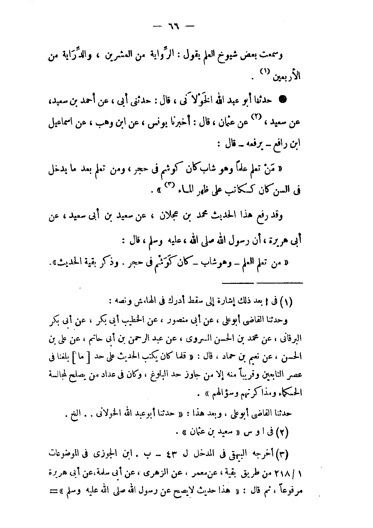 وَسَمِعْتُ بَعْضَ شُيُوخِ الْعِلْمِ يَقُولُ الرِّوَايَةُ مِنَ الْعِشْرِينَ وَالدِّرَايَةُ مِنَ الْأَرْبَعِينَ