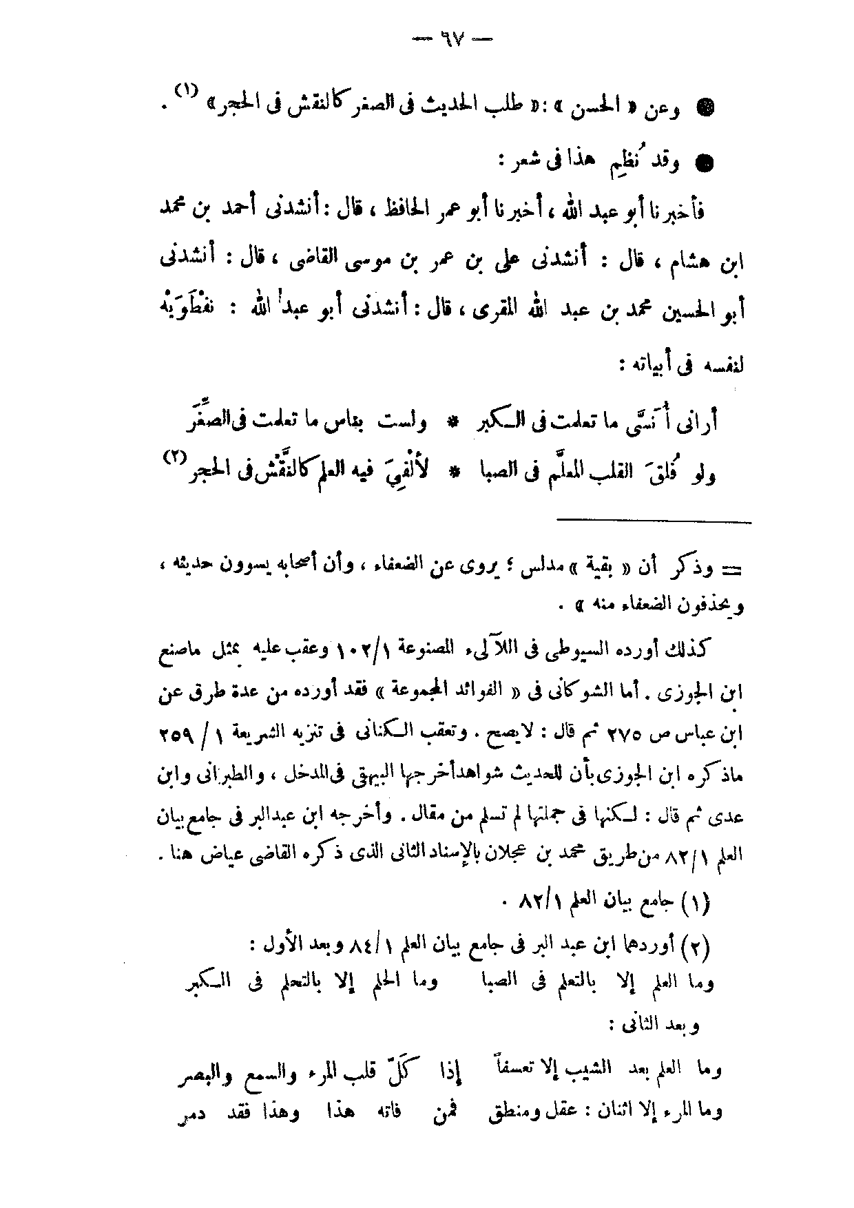 (أَرَانِي أَنْسَى مَا تَعَلَّمْتُ فِي الْكِبَرِ ... وَلَسْتُ بِنَاسٍ مَا تَعَلَّمْتُ فِي الصِّغَرِ)
