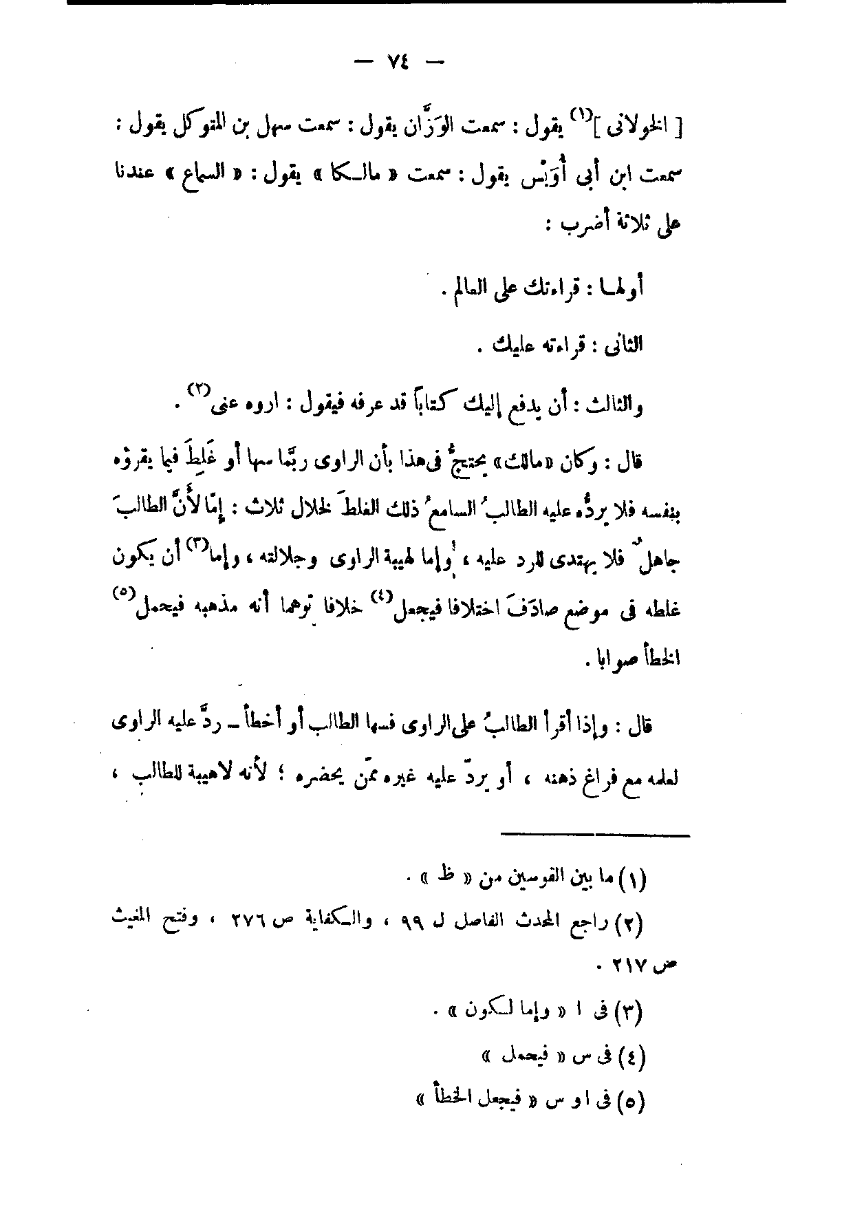 قَالَ وَكَانَ مَالِكٌ يَحْتَجُّ فِي هَذَا بِأَنَّ الرَّاوِي رُبَّمَا سَهَا أَوْ غَلِطَ فِيمَا يَقْرَؤُهُ بِنَفْسِهِ فَلَا يَرُدُّهُ عَلَيْهِ الطَّالِبُ السَّامِعُ ذَلِكَ الْغَلَطَ لِخِلَالٍ ثَلَاثٍ إِمَّا لِأَنَّ الطَّالِبَ جَاهِلٌ فَلَا يَهْتَدِي لِلرَّدِّ عَلَيْهِ وَإِمَّا لِهَيْبَةِ الرَّاوِي وَجَلَالَتِهِ وَإِمَّا أَنْ يَكُونَ غَلَطُهُ فِي مَوْضِعٍ صَادَفَ اخْتِلَافًا فَيَجْعَلُ خلافًا توهما أَنه مذْهبه فَيحمل الْخَطَأَ صَوَابًا