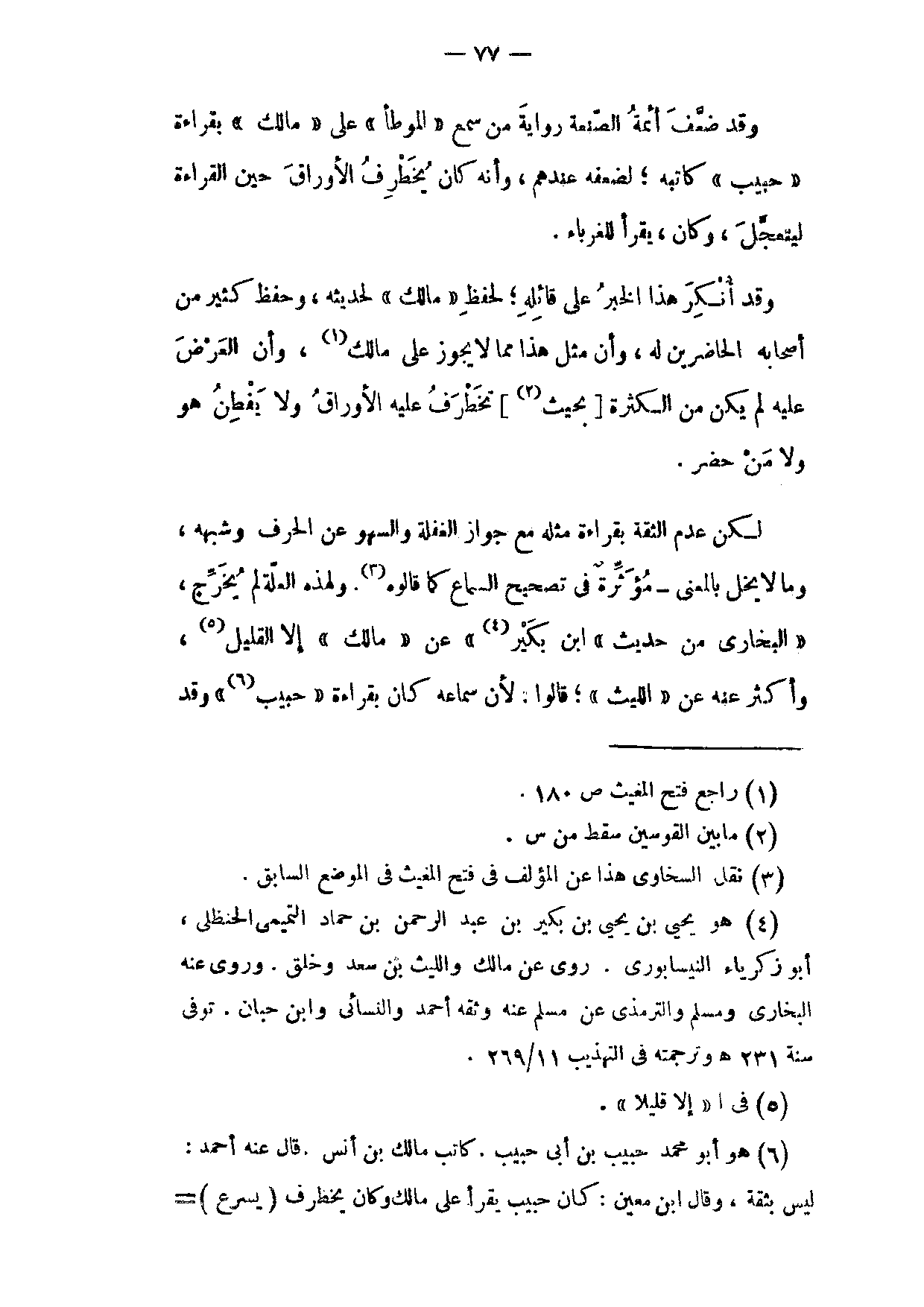 وَقَدْ ضَعَّفَ أَئِمَّةُ الصَّنْعَةِ رِوَايَةَ مَنْ سَمِعَ الْمُوَطَّأَ عَلَى مَالِكٍ بِقِرَاءَةِ حَبِيبٍ كَاتِبِهِ لِضَعْفِهِ عِنْدَهُمْ وَأَنَّهُ كَانَ يُخَطْرِفُ الْأَوْرَاقَ حِينَ الْقِرَاءَةِ لِيَتَعَجَّلَ وَكَانَ يَقْرَأُ لِلْغُرَبَاءِ