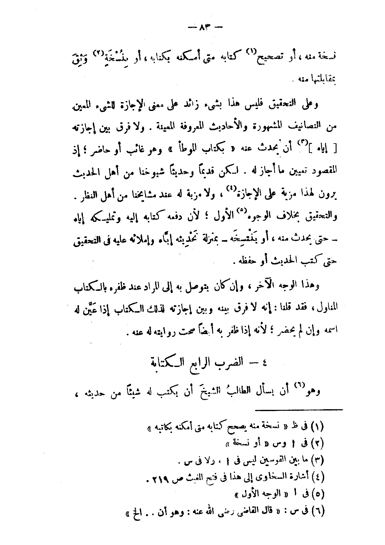 وَعَلَى التَّحْقِيقِ فَلَيْسَ هَذَا بِشَيْءٍ زَائِدٍ عَلَى مَعْنَى الْإِجَازَةِ لِلشَّيْءِ الْمُعَيَّنِ مِنَ التَّصَانِيفِ الْمَشْهُورَةِ وَالْأَحَادِيثِ الْمَعْرُوفَةِ الْمُعَيَّنَةِ وَلَا فَرْقَ بَيْنَ إِجَازَتِهِ إِيَّاهُ أَنْ يُحَدِّثَ عَنْهُ بِكِتَابِ الْمُوَطَّأِ وَهُوَ غَائِبٌ أَوْ حَاضِرٌ إِذِ الْمَقْصُودُ تَعْيِينُ مَا أَجَازَ لَهُ لَكِنْ قَدِيمًا وَحَدِيثًا شُيُوخُنَا مِنْ أَهْلِ الْحَدِيثِ يَرَوْنَ لِهَذَا مَزِيَّةً عَلَى الْإِجَازَةِ وَلَا مَزِيَّةَ لَهُ عِنْدَ مَشَايِخِنَا مِنْ أَهْلِ النَّظَرِ وَالتَّحْقِيقِ بِخِلَافِ الْوُجُوهِ الْأَوَّلُ لِأَنَّ دَفْعَهُ كِتَابَهِ إِلَيْهِ وَتَمْلِيكَهُ إِيَّاهُ حَتَّى يُحَدِّثَ مِنْهُ أَوْ يَنْتَسِخَهُ بِمَنْزِلَةِ تَحْدِيثِهِ إِيَّاهُ وَإمْلَائِهِ عَلَيْهِ فِي التَّحْقِيقِ حَتَّى كَتَبَ الْحَدِيثَ أَوْ حَفِظَهُ