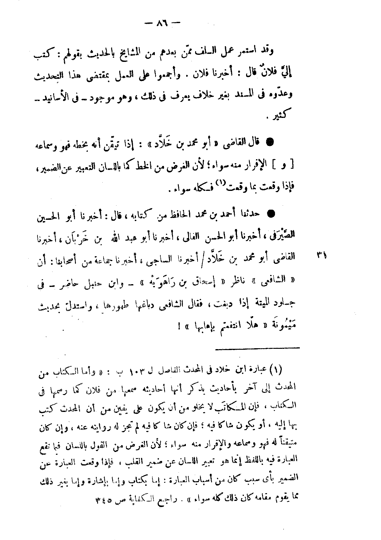 قَالَ الْقَاضِي أَبُو مُحَمَّدِ بْنُ خَلَّادٍ إِذَا تَيَقَّنَ أَنَّهُ بِخَطِّهِ فَهُوَ وسماعه وَالْإِقْرَار مِنْهُ سَوَاءٌ لِأَنَّ الْغَرَضَ مِنَ الْخَطِّ كَمَا بِاللِّسَانِ التَّعْبِيرُ عَنِ الضَّمِيرِ فَإِذَا وَقَعْتَ بِمَا وَقَعْتُ فَكُلُّهُ سَوَاءٌ