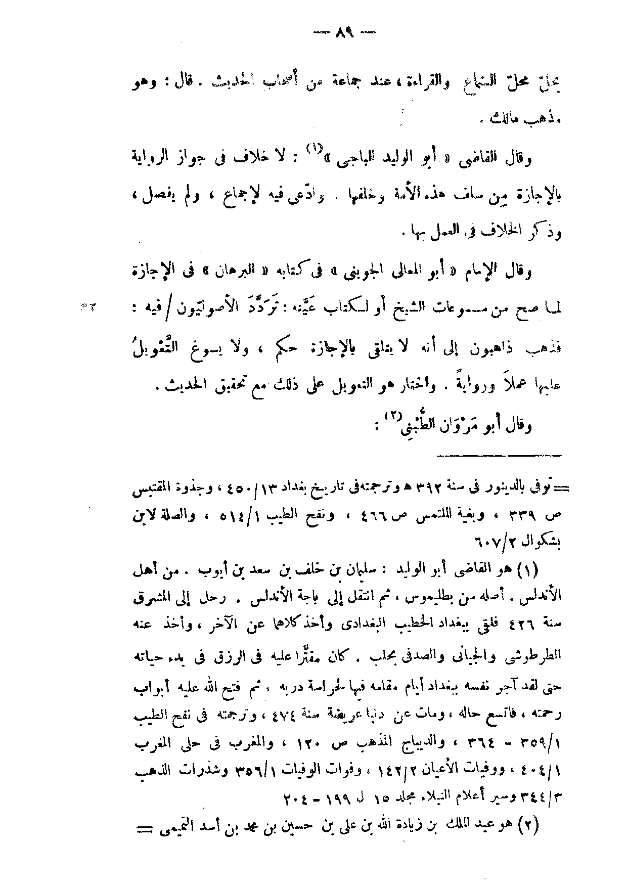 وَقَالَ الْإِمَامُ أَبُو الْمَعَالِي الْجُوَيْنِيُّ فِي كِتَابِهِ الْبُرْهَانِ فِي الْإِجَازَةِ لِمَا صَحَّ مِنْ مَسْمُوعَاتِ الشَّيْخِ أَوْ لِكِتَابٍ عَيَّنَهُ تَرَدَّدَ الْأُصُولِيُّونَ فِيهِ فَذَهَبَ ذَاهِبُونَ إِلَى أَنَّهُ لَا يُتَلَقَّى بِالْإِجَازَةِ حُكْمٌ وَلَا يُسَوِّغُ التَّعْوِيلُ عَلَيْهَا عَمَلًا وَرِوَايَةً وَاخْتَارَ هُوَ التَّعْوِيلَ عَلَى ذَلِكَ مَعَ تَحْقِيقِ الْحَدِيثِ وَقَالَ أَبُو مَرْوَانَ الطُّبُنِيُّ