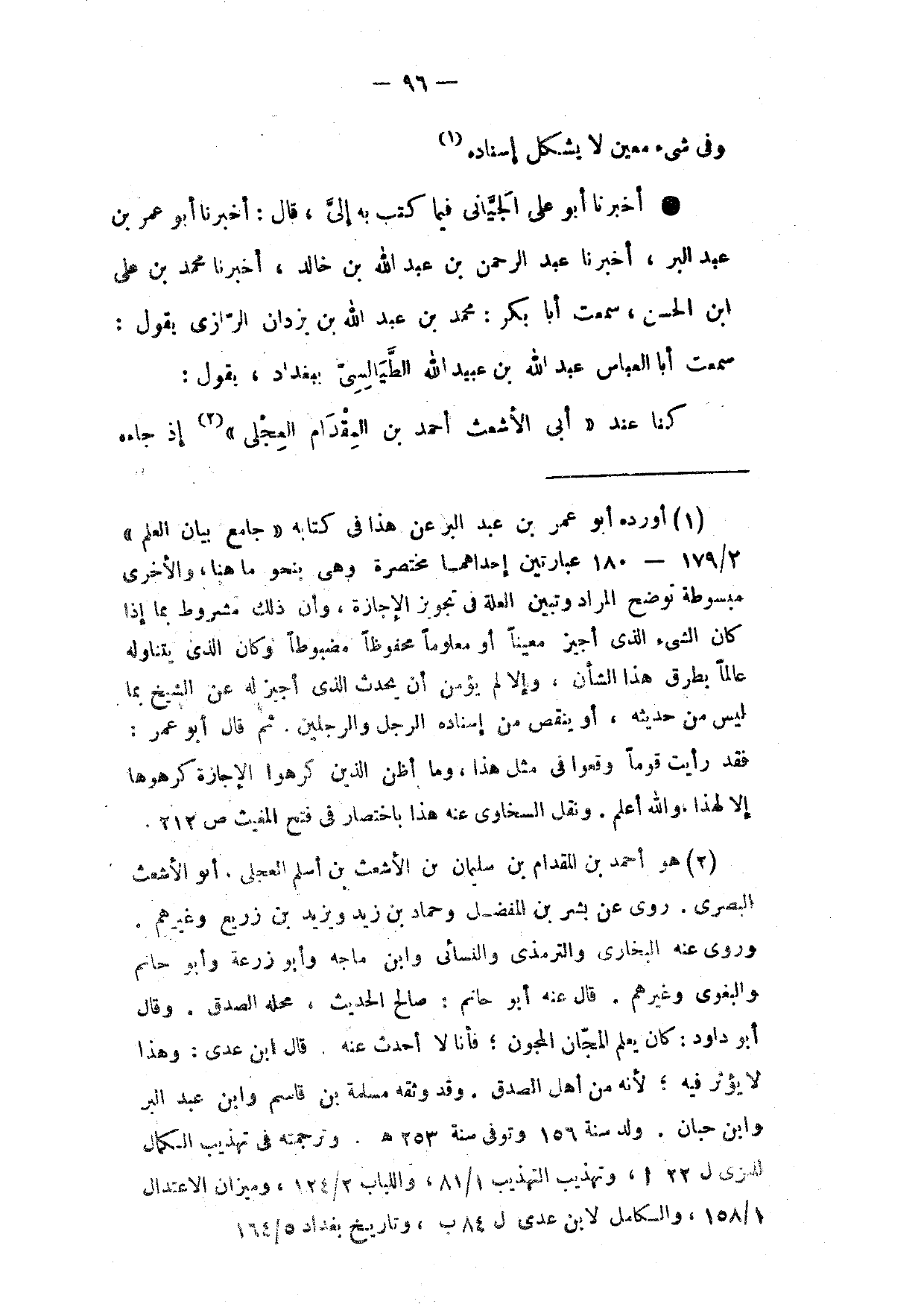 أَخْبَرَنَا أَبُو عَلِيٍّ الْجَيَّانِيُّ فِيمَا كَتَبَ بِهِ إِلَيَّ قَالَ أَخْبَرَنَا أَبُو عُمَرَ بْنُ عَبْدِ الْبَرِّ أَخْبَرَنَا عَبْدُ الرَّحْمَنِ بْنُ عَبْدِ اللَّهِ بْنِ خَالِدٍ أَخْبَرَنَا مُحَمَّد بن على ابْن الْحَسَنِ سَمِعْتُ أَبَا بَكْرٍ مُحَمَّدَ بن عبد الله بن بزدان الرَّازِيَّ يَقُولُ سَمِعْتُ أَبَا الْعَبَّاسِ عَبْدَ اللَّهِ بْنَ عُبَيْدِ اللَّهِ الطَّيَالِسِيَّ بِبَغْدَادَ يَقُولُ كُنَّا عِنْدَ أَبِي الْأَشْعَثِ أَحْمَدَ بْنِ الْمِقْدَامِ الْعِجْلِيِّ إِذْ جَاءَهُ
