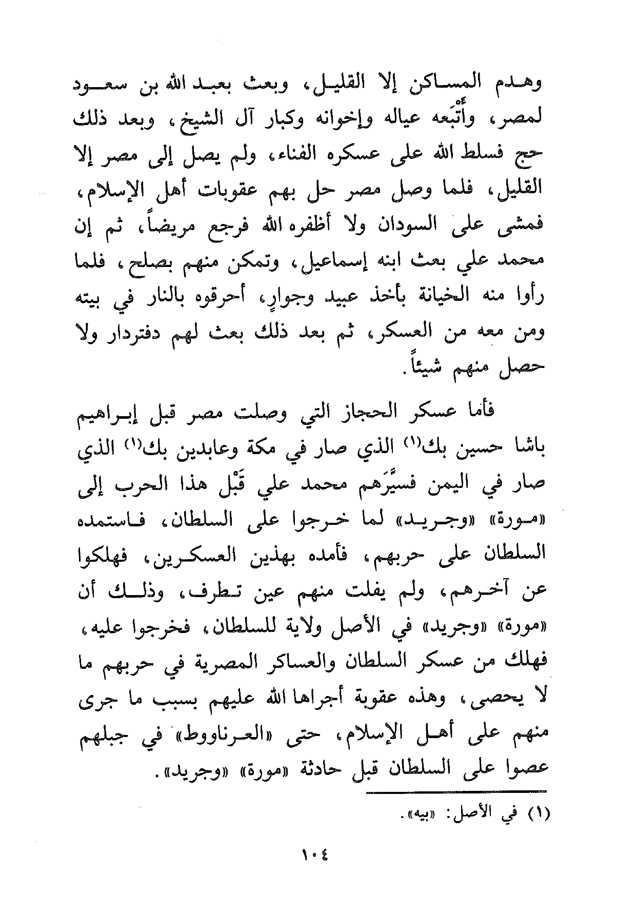 فأما عسكر الحجاز التي وصلت مصر قبل إبراهيم باشا حسين بك1 الذي صار في مكة وعابدين بك2 الذي صار في اليمن فسيرهم محمد علي قبل هذا الحرب إلى "مورة" "وجريد" لما خرجوا على السلطان، فاستمده السلطان على حربهم، فأمده بهذين العسكرين، فهلكوا عن آخرهم، ولم يفلت منهم عين تطرف، وذلك أن "مورة" "وجريد" في الأصل ولاية للسلطان، فخرجوا عليه، فهلك من عسكر السلطان والعساكر المصرية في حربهم ما لا يحصى، وهذه عقوبة أجراها الله عليهم بسبب ما جرى منهم على أهل الإسلام، حتى "العرناووط" في جبلهم عصوا على السلطان قبل حادثة "مورة" "وجريد".