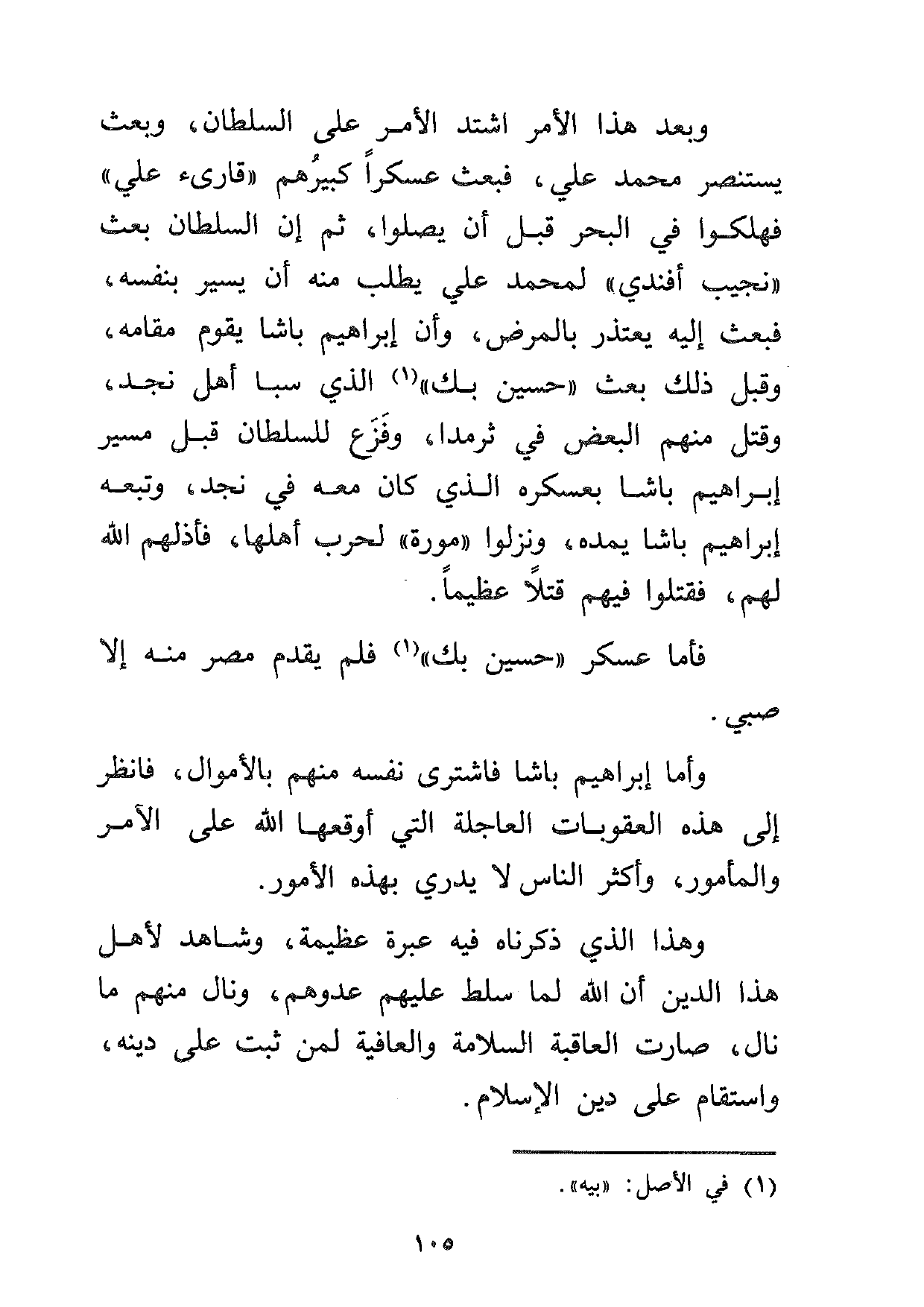 وبعد هذا الأمر اشتد الأمر على السلطان، وبعث يستنصر محمد علي، فبعث عسكراً كبيرهم "قارئ علي" فهلكوا في البحر قبل أن يصلوا، ثم إن السلطان بعث "نجيب أفندي" لمحمد علي يطلب منه أن يسير بنفسه، فبعث إليه يعتذر بالمرض، وأن إبراهيم باشا يقوم مقامه، وقبل ذلك بعث "حسين بك"1 الذي سبا أهل نجد، وقتل منهم البعض في ثرمدا، وفزع للسلطان قبل مسير إبراهيم باشا بعسكره الذي كان معه في نجد، وتبعه إبراهيم باشا يمده، ونزلوا "مورة" لحرب أهلها، فأذلهم الله لهم، فقتلوا فيهم قتلاً عظيماً.