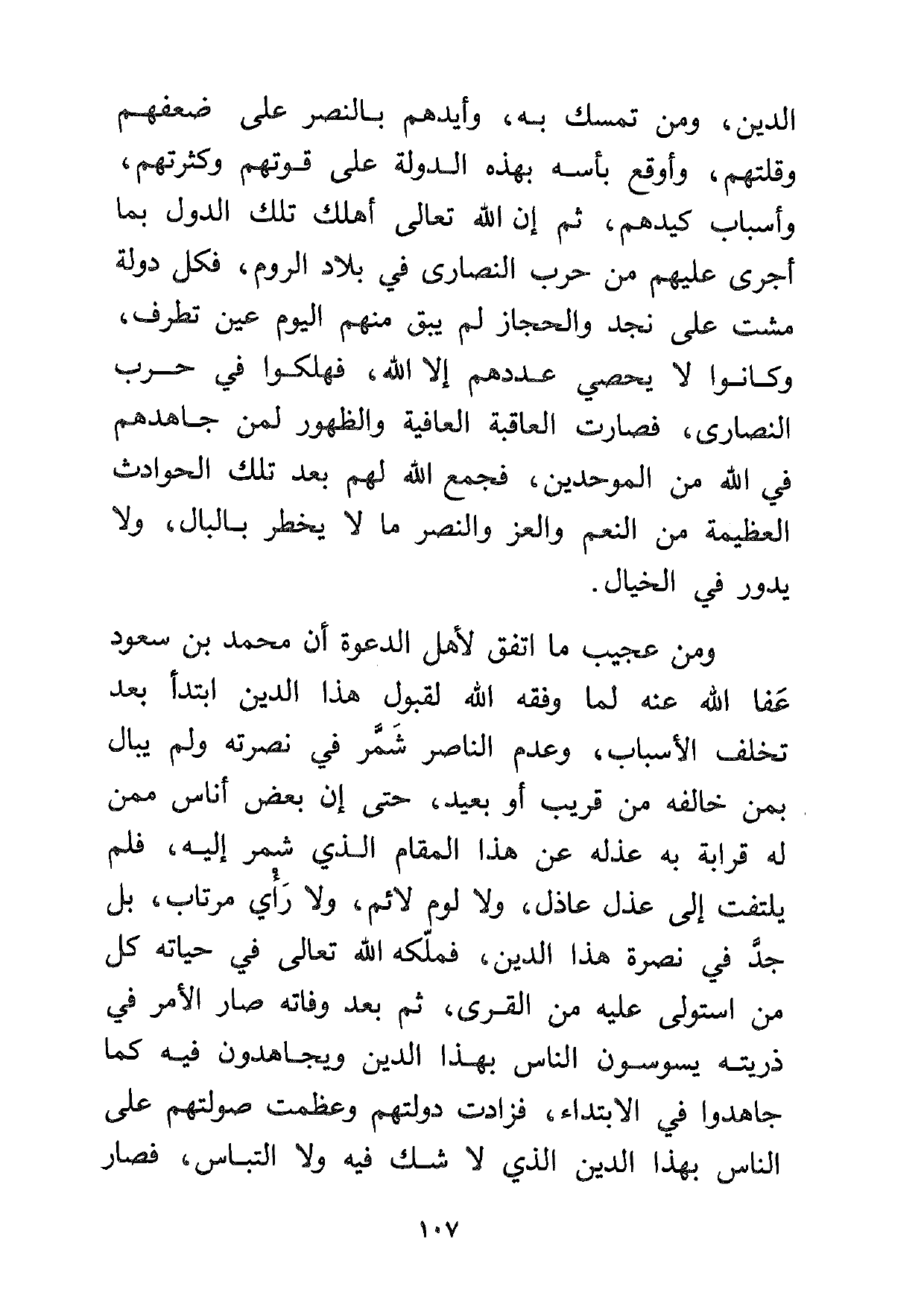 ومن عجيب ما اتفق لأهل الدعوة أن محمد بن سعود عفا الله عنه لما وفقه الله لقبول هذا الدين ابتدأ بعد تخلف الأسباب، وعدم الناصر شمر في نصرته ولم يبال بمن خالفه من قريب أو بعيد، حتى إن بعض أناس ممن له قرابة به عذله عن هذا المقام الذي شمر إليه، فلم يلتفت إلى عذل عاذل، ولا لوم لائم، ولا رأي مرتاب، بل جد في نصرة هذا الدين، فملكه الله تعالى في حياته كل من استولى عليه من القرى، ثم بعد وفاته صار الأمر في ذريته يسوسون الناس بهذا الدين ويجاهدون فيه كما جاهدوا في الابتداء، فزادت دولتهم وعظمت صولتهم على الناس بهذا الدين الذي لا شك فيه ولا التباس، فصار