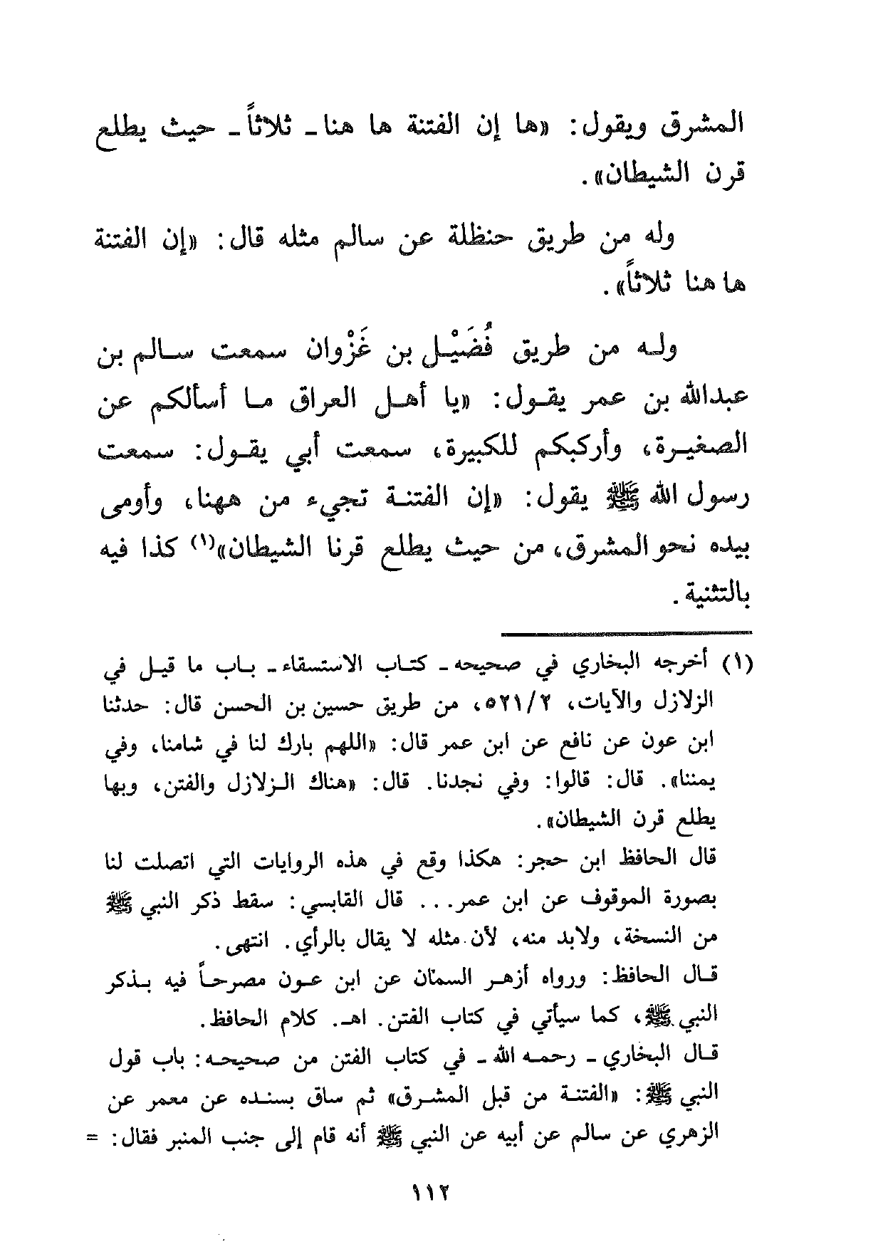 قال البخاري رحمه الله في كتاب الفتن من صحيحه: باب قول النبي صلى الله عليه وسلم: "الفتنة من قبل المشرق"، ثم ساق بسنده عن معمر عن الزهري عن سالم عن أبيه عن النبي صلى الله عليه وسلم أنه قام إلى جنب المنبر فقال: =