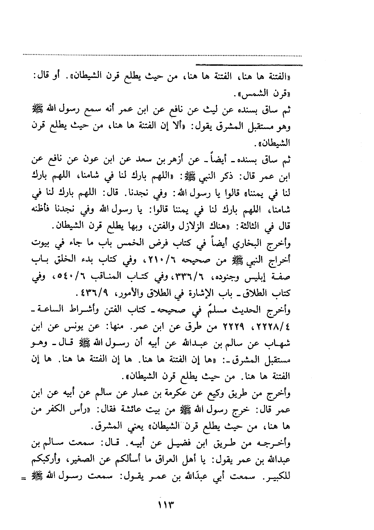 = "الفتنة ها هنا، الفتنة ها هنا، من حيث يطلع قرن الشيطان". أو قال: "قرن الشمس".