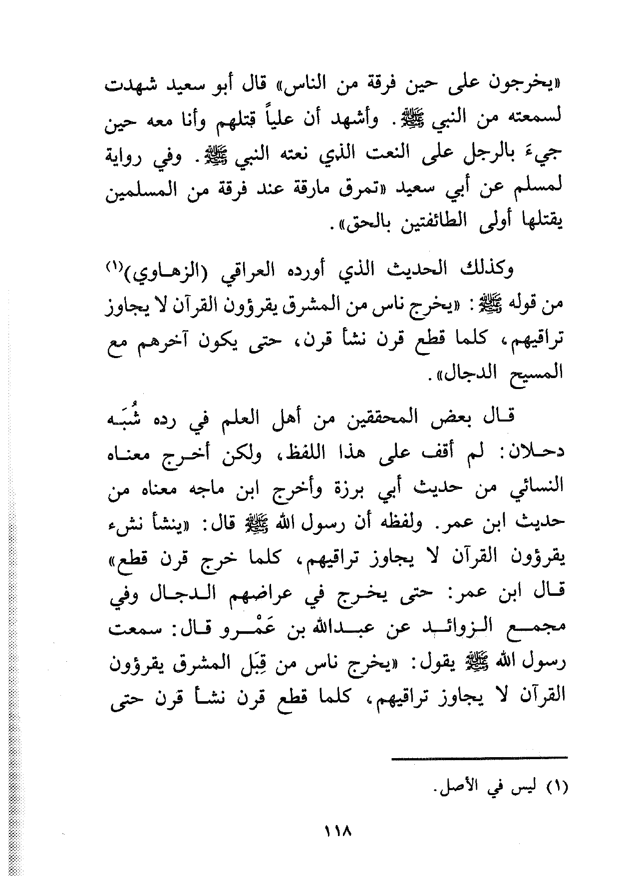 وأخرج البخاري عن بشير بن عمرو قال: قلت لسهل بن حنيف هل سمعت النبي صلى الله عليه وسلم يقول في الخوارج شيئاً؟ قال: سمعته يقول وأهوى بيده قبل العراق: "يخرج منه قوم يقرؤون القرآن لا يجاوز تراقيهم، يمرقون من الإسلام مروق السهم من الرمية".