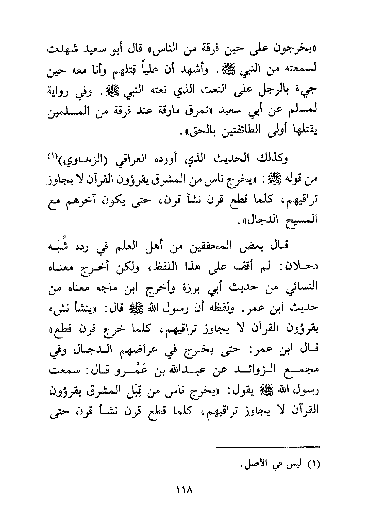 وكذلك الحديث الذي أورده العراقي (الزهاوي) 1 من قوله صلى الله عليه وسلم: " يخرج ناس من المشرق يقرؤون القرآن لا يجاوز تراقيهم، كلما قطع قرن نشأ قرن، حتى يكون آخرهم مع المسيح الدجال".