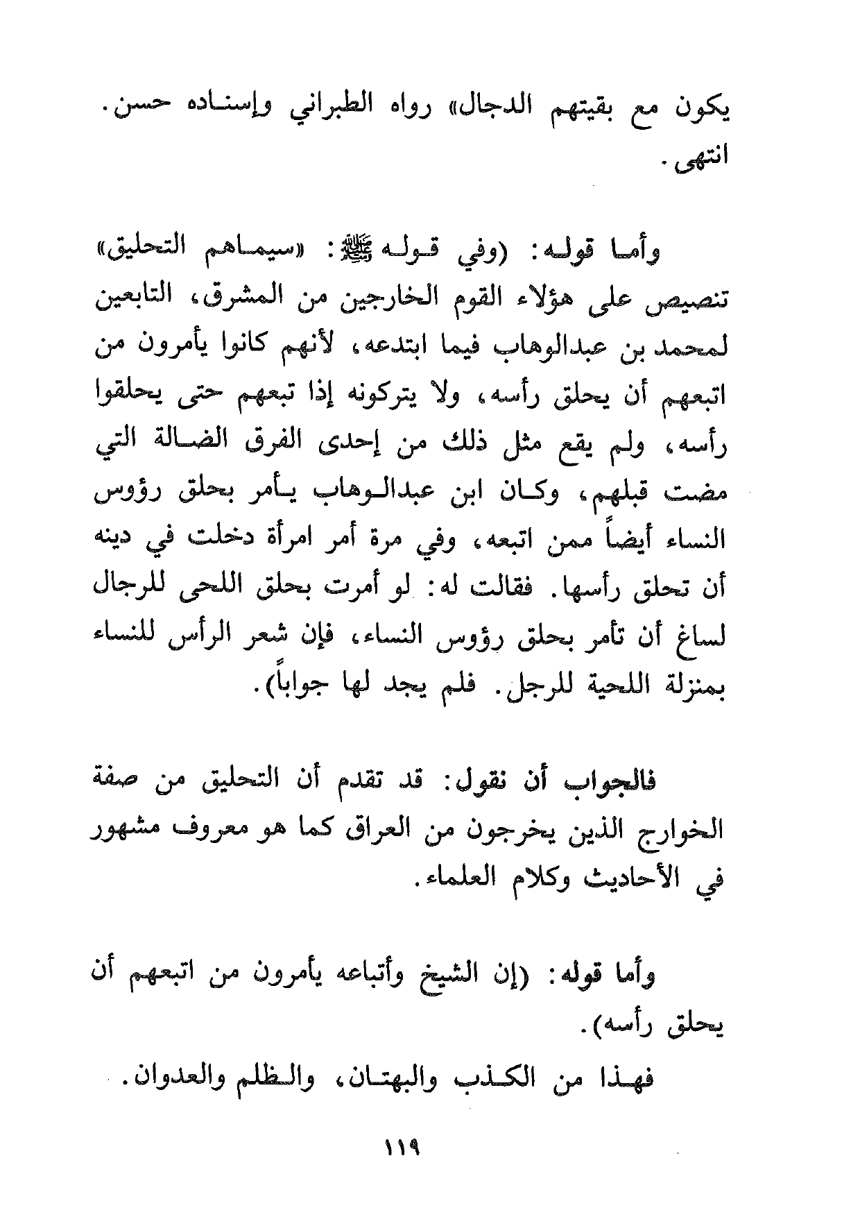 وأما قوله: (وفي قوله صلى الله عليه وسلم: "سيماهم التحليق" تنصيص على هؤلاء القوم الخارجين من المشرق، التابعين لمحمد بن عبد الوهاب فيما ابتدعه، لأنهم كانوا يأمرون من اتبعهم أن يحلق رأسه، ولا يتركونه إذا تبعهم حتى يحلقوا رأسه، ولم يقع مثل ذلك من إحدى الفرق الضالة التي مضت قبلهم، وكان ابن عبد الوهاب يأمر بحلق رؤوس النساء أيضاً ممن اتبعه، وفي مرة أمر امرأة دخلت في دينه أن تحلق رأسها. فقالت له: لو أمرت بحلق اللحى للرجال لساغ أن تأمر بحلق رؤوس النساء، فإن شعر الرأس للنساء بمنزلة اللحية للرجل. فلم يجد لها جواباً) .