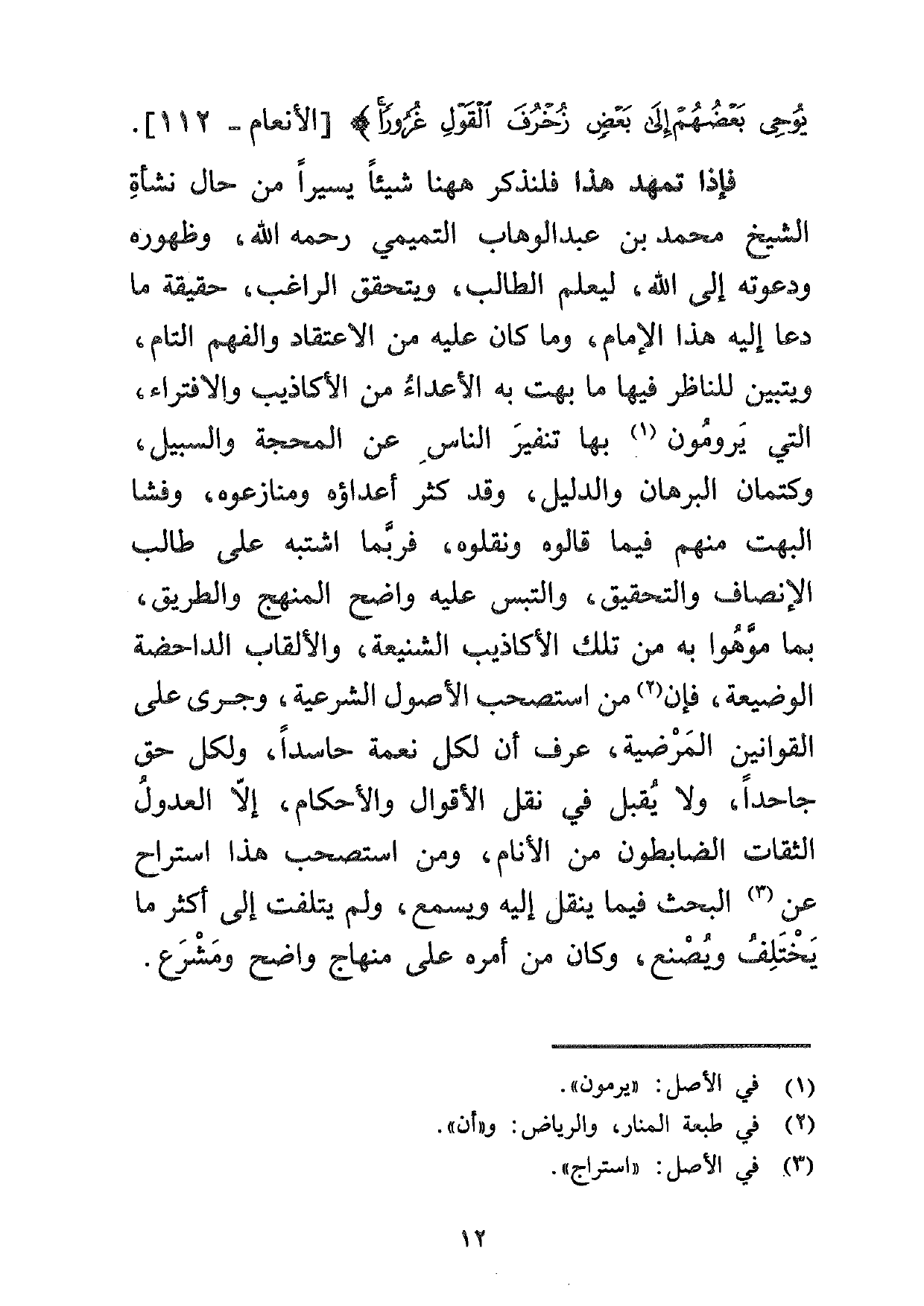 فإذا تمهد هذا فلنذكر ههنا شيئاً يسيراً من حال نشأة الشيخ محمد بن عبد الوهاب التميمي رحمه الله، وظهوره ودعوته إلى الله، ليعلم الطالب، ويتحقق الراغب، حقيقة ما دعا إليه هذا الإمام، وما كان عليه من الاعتقاد والفهم التام، ويتبين للناظر فيها ما بهت به الأعداءُ من الأكاذيب والافتراء، التي يرومون1 بها تنفير الناسِ عن المحجة والسبيل، وكتمان البرهان والدليل، وقد كثر أعداؤه ومنازعوه، وفشا البهت منهم فيما قالوه ونقلوه، فربما اشتبه على طالب الإنصاف والتحقيق، والتبس عليه واضح المنهج والطريق، بما موّهوا به من تلك الأكاذيب الشنيعة، والألقاب الداحضة الوضيعة، فإن2 من استصحب الأصول الشرعية، وجري على القوانين المرضية، عرف أن لكل نعمة حاسداً، ولكل حق جاحداً، ولا يقبل في نقل الأقوال والأحكام، إلا العدول الثقات الضابطون من الأنام، ومن استصحب هذا استراح عن3 البحث فيما ينقل إليه ويسمع، ولم يتلفت إلى أكثر ما يختلف ويصنع، وكان من أمره على منهاج واضح ومشرَع.