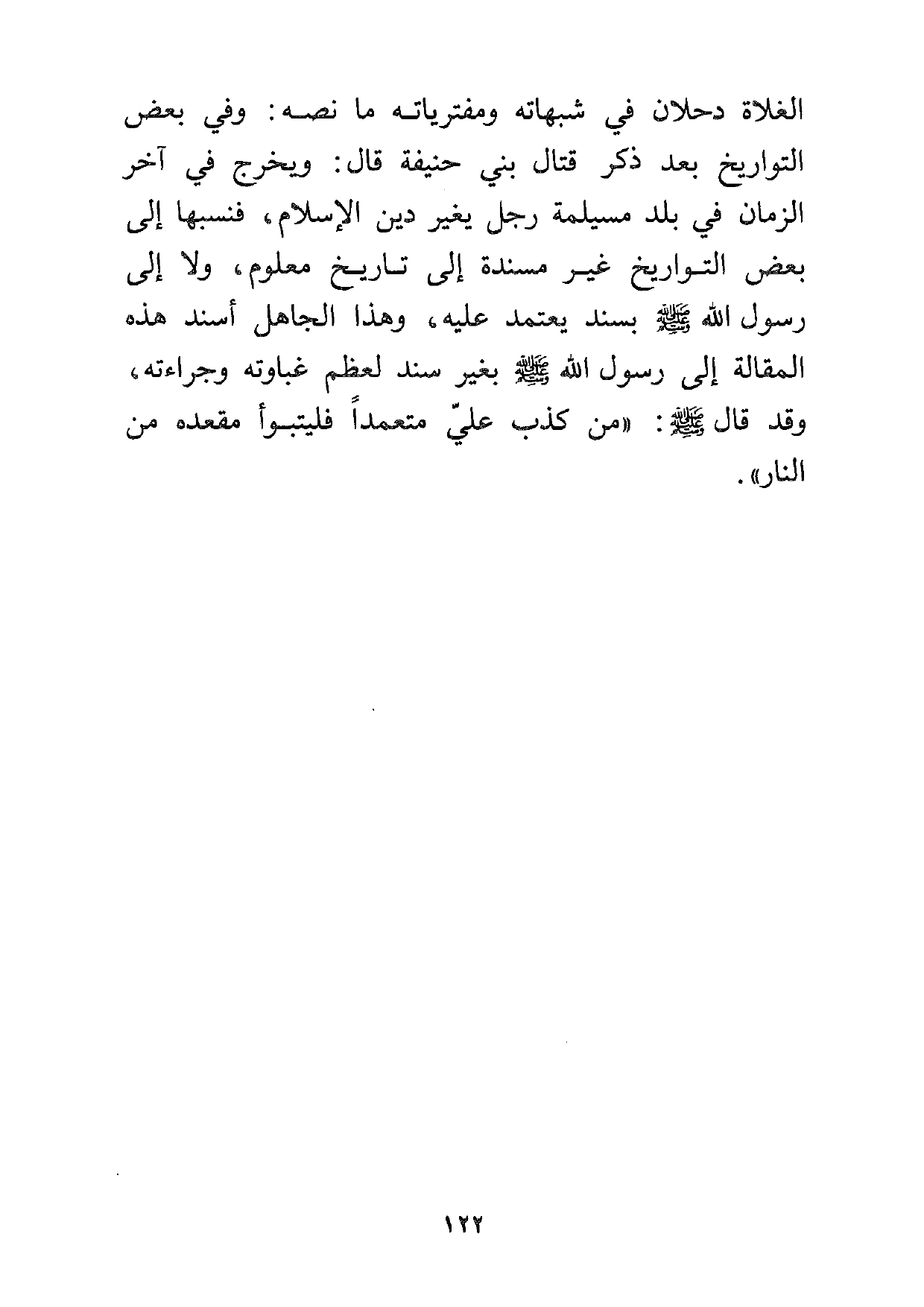 الغلاة دحلان في شبهاته ومفترياته ما نصه: وفي بعض التواريخ بعد ذكر قتال بني حنيفة قال: ويخرج في آخر الزمان في بلد مسيلمة رجل يغير دين الإسلام، فنسبها إلى بعض التواريخ غير مسندة إلى تاريخ معلوم، ولا إلى رسول الله صلى الله عليه وسلم بسند يعتمد عليه، وهذا الجاهل أسند هذه المقالة إلى رسول الله صلى الله عليه وسلم بغير سند لعظم غباوته وجراءته، وقد قال صلى الله عليه وسلم: "من كذب علي متعمداً فليتبوأ مقعده من النار".