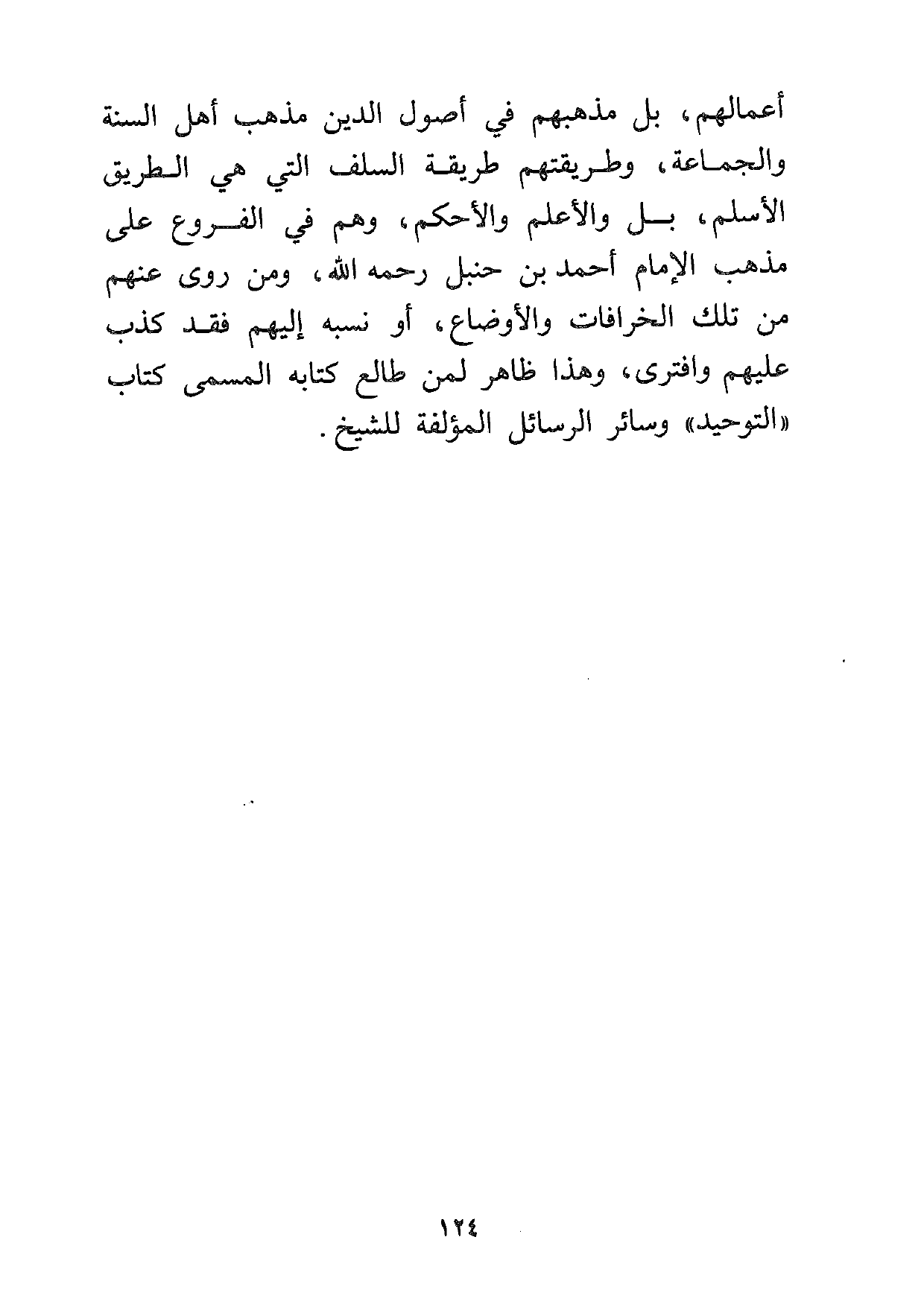 أعمالهم، بل مذهبهم في أصول الدين مذهب أهل السنة والجماعة، وطريقتهم طريقة السلف التي هي الطريق الأسلم، بل والأعلم والأحكم، وهم في الفروع على مذهب الإمام أحمد بن حنبل رحمه الله، ومن روى عنهم من تلك الخرافات والأوضاع، أو نسبه إليهم فقد كذب عليهم وافترى، وهذا ظاهر لمن طالع كتابه المسمى كتاب "التوحيد" وسائر الرسائل المؤلفة للشيخ.