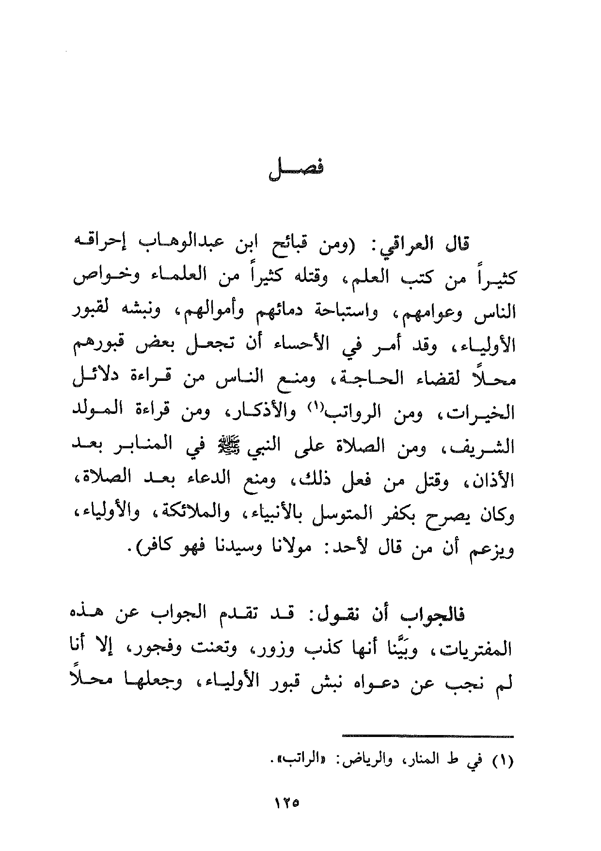 قال العراقي: (ومن قبائح ابن عبد الوهاب إحراقه كثيراً من كتب العلم، وقتله كثيراً من العلماء وخواص الناس وعوامهم، واستباحة دمائهم وأموالهم، ونبشه لقبور الأولياء، وقد أمر في الأحساء أن تجعل بعض قبورهم محلاً لقضاء الحاجة، ومنع الناس من قراءة دلائل الخيرات، ومن الراوتب1 والأذكار، ومن قراءة المولد الشريف ومن الصلاة على النبي صلى الله عليه وسلم في المنابر بعد الأذان، وقتل من فعل ذلك، ومنع الدعاء بعد الصلاة، وكان يصرح بكفر المتوسل بالأنبياء والملائكة والأولياء، ويزعم أن من قال لأحد: مولانا وسيدنا فهو كافر) .