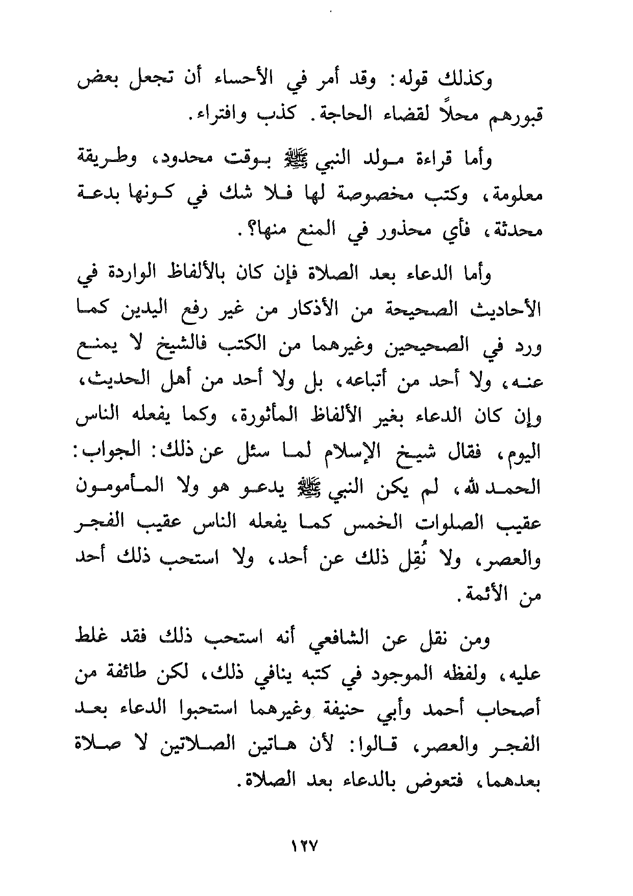 وأما الدعاء بعد الصلاة فإن كان بالألفاظ الواردة في الأحاديث الصحيحة من الأذكار من غير رفع اليدين كما ورد في الصحيحين وغيرهما من الكتب، فالشيخ لا يمنع عنه، ولا أحد من أتباعه، بل ولا أحد من أهل الحديث، وإن كان الدعاء بغير الألفاظ المأثورة، وكما يفعله الناس اليوم، فقال شيخ الإسلام لما سئل عن ذلك: الجواب: الحمد لله، لم يكن النبي صلى الله عليه وسلم يدعو هو ولا المأمومون عقيب الصلوات الخمس كما يفعله الناس عقيب الفجر والعصر، ولا نقل ذلك عن أحد، ولا استحب ذلك أحد من الأئمة.