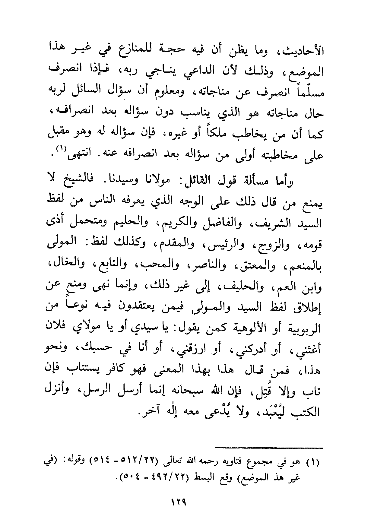 وأما مسألة قول القائل: مولانا وسيدنا. فالشيخ لا يمنع من قال ذلك على الوجه الذي يعرفه الناس من لفظ السيد الشريف، والفاضل الكريم، والحليم ومتحمل أذى قومه والزوج والرئيس والمقدم، وكذلك لفظ: المولى بالمنعم والمعتق والناصر والمحب والتابع والخال وابن العم والحليف، إلى غير ذلك، وإنما نهى ومنع عن إطلاق لفظ السيد والمولى فيمن يعتقدون فيه نوعاً من الربوبية أو الألوهية كمن يقول: يا سيدي أو يا مولاي فلان أغثني أو أدركني أو ارزقني، أو أنا في حسبك، ونحو هذا، فمن قال هذا بهذا المعنى فهو كافر يستتاب فإن تاب وإلا قتل، فإن الله سبحانه إنما أرسل الرسل، وأنزل الكتب ليعبد، ولا يدعى معه إله آخر.