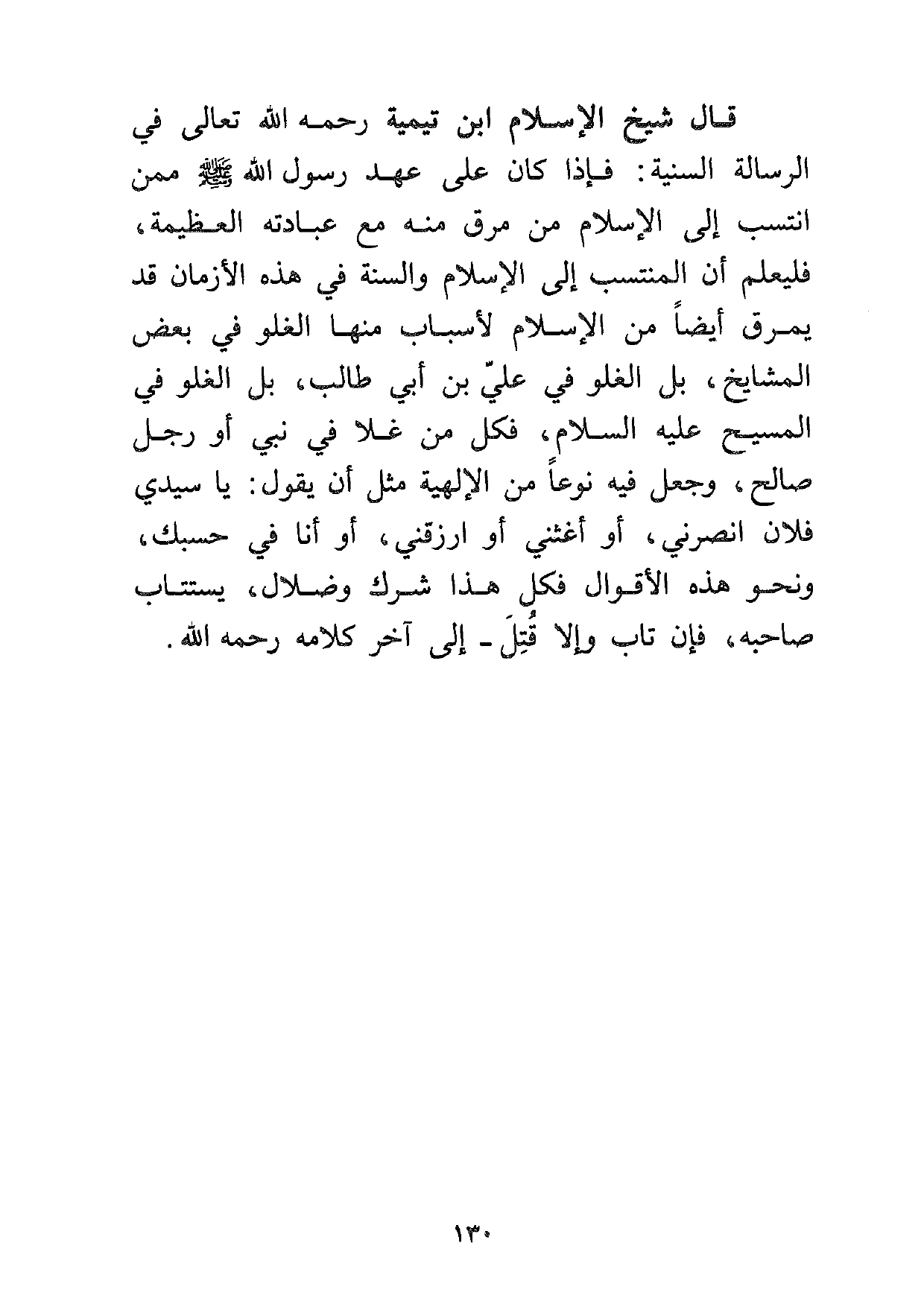 قال شيخ الإسلام ابن تيمية رحمه الله تعالى في الرسالة السنية: فإذا كان على عهد رسول الله صلى الله عليه وسلم ممن انتسب إلى الإسلام من مرق منه مع عبادته العظيمة، فليعلم أن المنتسب إلى الإسلام والسنة في هذه الأزمان قد يمرق أيضاً من الإسلام لأسباب منها الغلو في بعض المشايخ، بل الغلو في علي بن أبي طالب، بل الغلو في المسيح عليه السلام، فكل من غلا في نبي أو رجل صالح، وجعل فيه نوعاً من الإلهية مثل أن يقول: يا سيدي فلان انصرني، أو أغني أو ارزقني أو أنا في حسبك، ونحو هذه الأقوال فكل هذا شرك وضلال، يستتاب صاحبه، فإن تاب وإلا قتل –إلى آخر كلامه رحمه الله.