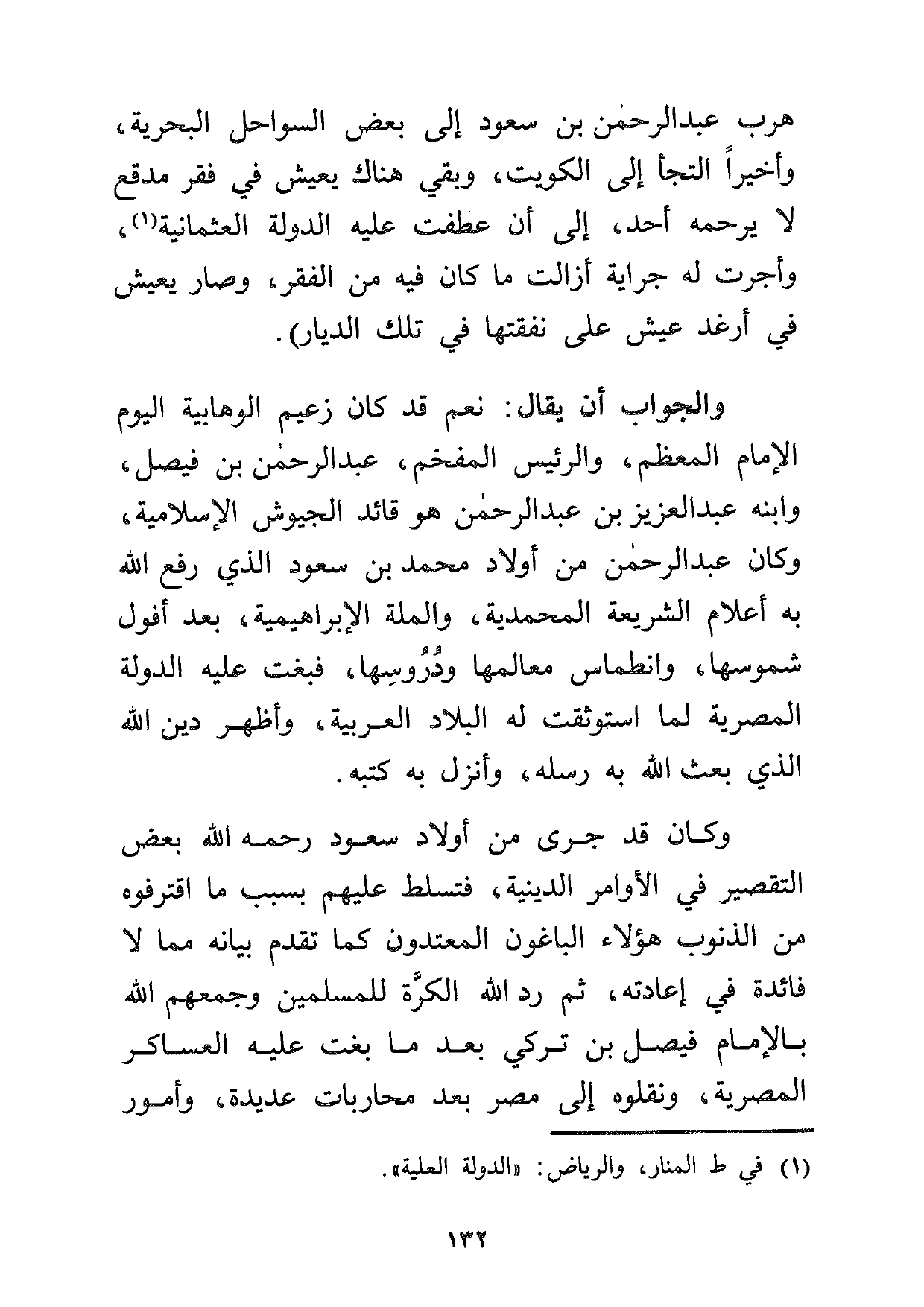والجواب أن يقال: نعم قد كان زعيم الوهابية اليوم الإمام المعظم، والرئيس المفخم، عبد الرحمن بن فيصل، وابنه عبد العزيز بن عبد الرحمن هو قائد الجيوش الإسلامية، وكان عبد الرحمن من أولاد محمد بن سعود الذي رفع الله به أعلام الشريعة المحمدية، والملة الإبراهيمية، بعد أفول شموسها، وانطماس معالمها ودروسها، فبغت عليه الدولة المصرية لما استوثقت له البلاد العربية، وأظهر دين الله الذي بعث الله به رسله، وأنزل به كتبه.