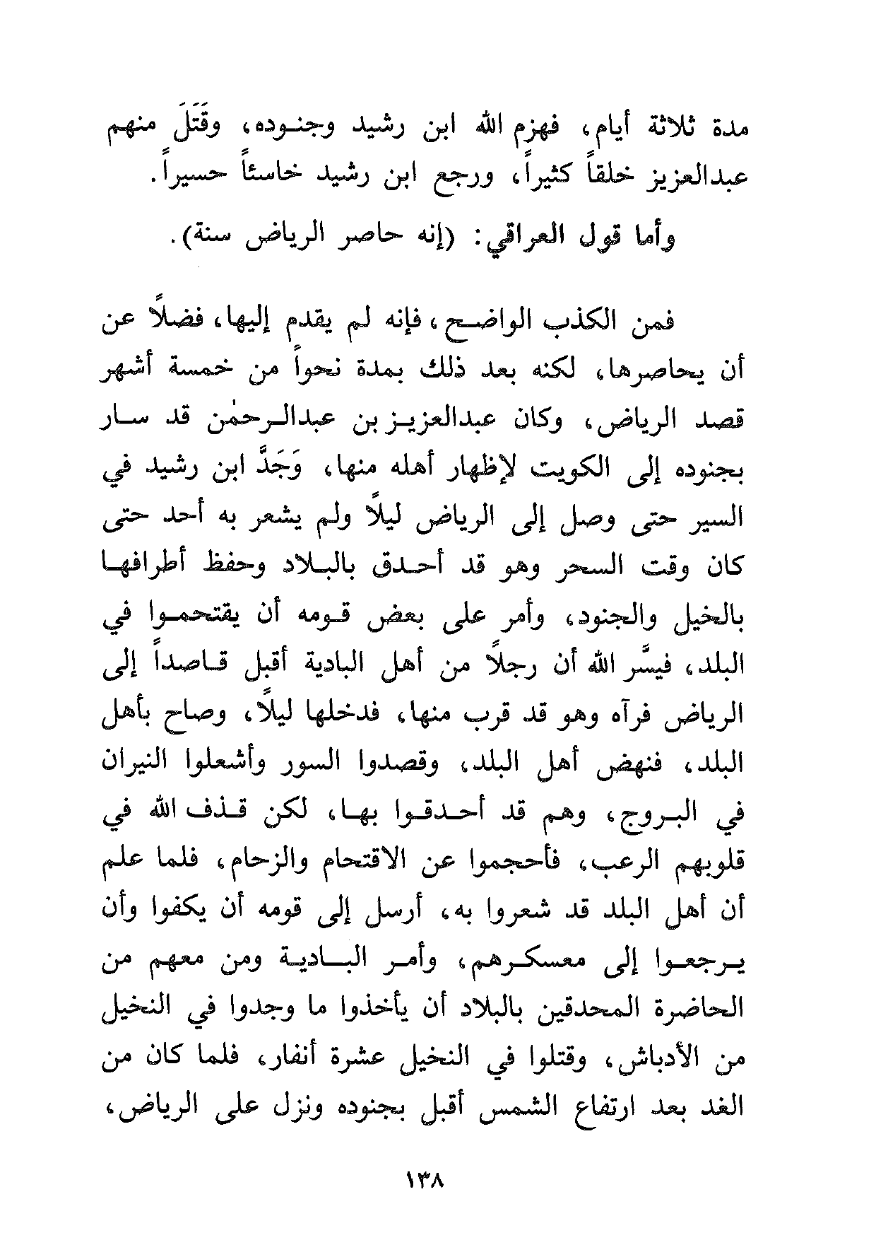 فمن الكذب الواضح، فإنه لم يقدم إليها، فضلاً عن أن يحاصرها، لكنه بعد ذلك بمدة نحواً من خمسة أشهر قصد الرياض، وكان عبد العزيز بن عبد الرحمن قد سار بجنوده إلى الكويت لإظهار أهله منها، وجد ابن رشيد في السير حتى وصل إلى الرياض ليلاً ولم يشعر به أحد حتى كان وقت السحر وهو قد أحدق بالبلاد وحفظ أطرافها بالخيل والجنود، وأمر على بعض قومه أن يقتحموا في البلد، فيسر الله أن رجلاً من أهل البادية أقبل قاصداً إلى الرياض فرآه وهو قد قرب منها، فدخلها ليلاً، وصاح بأهل البلد، فنهض أهل البلد، وقصدوا السور وأشعلوا النيران في البروج، وهم قد أحدقوا بها، لكن قذف الله في قلوبهم الرعب، فأحجموا عن الاقتحام والزحام، فلما علم أن أهل البلد قد شعروا به، أرسل إلى قومه أن يكفوا وأن يرجعوا إلى معسكرهم، وأمر البادية ومن معهم من الحاضرة المحدقين بالبلاد أن يأخذوا ما وجدوا في النخيل من الأدباش، وقتلوا في النخيل عشرة أنفار، فلما كان من الغد بعد ارتفاع الشمس أقبل بجنوده ونزل على الرياض،