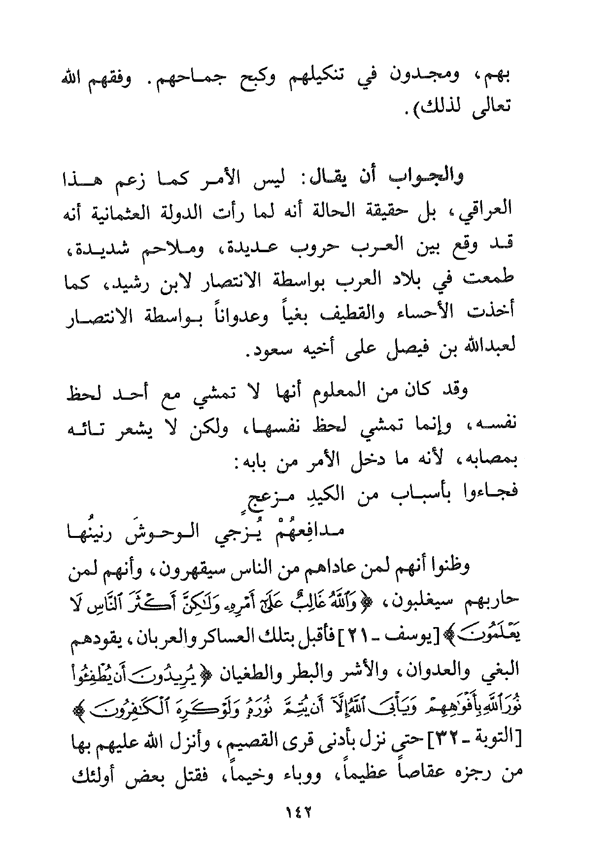 والجواب أن يقال: ليس الأمر كما زعم هذا العراقي، بل حقيقة الحالة أنه لما رأت الدولة العثمانية أنه قد وقع بين العرب حروب عديدة، وملاحم شديدة، طمعت في بلاد العرب بواسطة الانتصار لابن رشيد، كما أخذت الأحساء والقطيف بغياً وعدواناً بواسطة الانتصار لعبد الله بن فيصل على أخيه سعود.