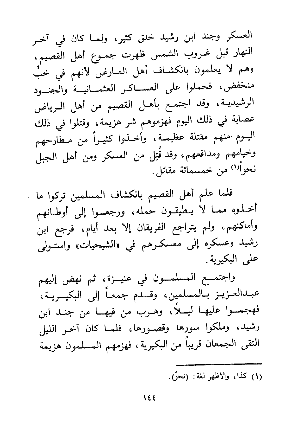 العسكر وجند ابن رشيد خلق كثير، ولما كان في آخر النهار قبل غروب الشمس ظهرت جموع أهل القصيم، وهم لا يعلمون بانكشاف أهل العارض لأنهم في خب منخفض، فحملوا على العساكر العثمانية والجنود الرشيدية، وقد اجتمع بأهل القصيم من أهل الرياض عصابة في ذلك اليوم فهزموهم شر هزيمة، وقتلوا في ذلك اليوم منهم مقتلة عظيمة، وأخذوا كثيراً من مطارحهم وخيامهم ومدافعهم، وقد قتل من العسكر ومن أهل الجبل نحواً1 من خمسمائة مقاتل.