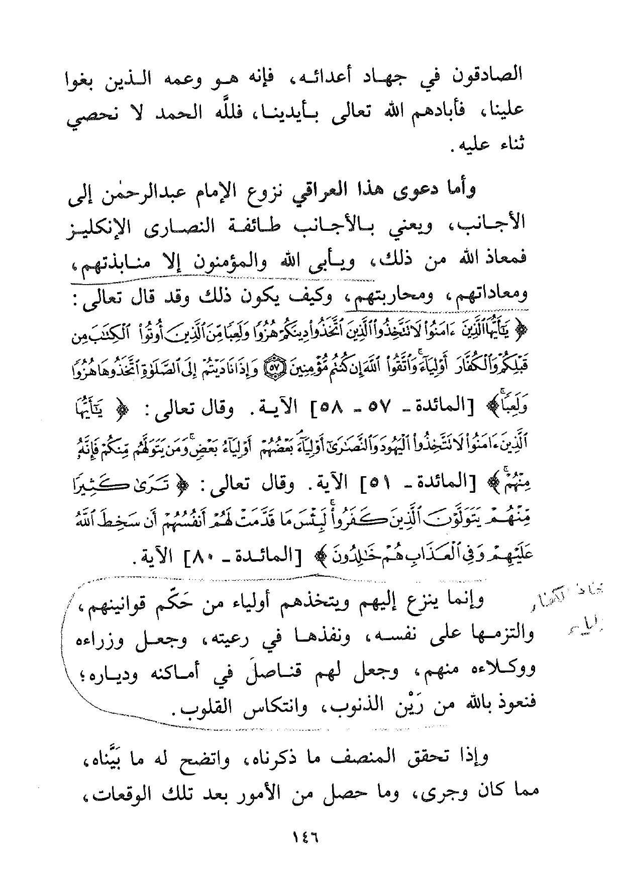 وأما دعوى هذا العراقي نزوع الإمام عبد الرحمن إلى الأجانب، ويعني بالأجانب طائفة النصارى الإنكليز فمعاذ الله من ذلك، ويأبى الله والمؤمنون إلا منابذتهم، ومعاداتهم ومحاربتهم، وكيف يكون ذلك وقد قال تعالى: {يَا أَيُّهَا الَّذِينَ آمَنُوا لا تَتَّخِذُوا الَّذِينَ اتَّخَذُوا دِينَكُمْ هُزُواً وَلَعِباً مِنَ الَّذِينَ أُوتُوا الْكِتَابَ مِنْ قَبْلِكُمْ وَالْكُفَّارَ أَوْلِيَاءَ وَاتَّقُوا اللَّهَ إِنْ كُنْتُمْ مُؤْمِنِينَ. وَإِذَا نَادَيْتُمْ إِلَى الصَّلاةِ اتَّخَذُوهَا هُزُواً وَلَعِباً} [المائدة: 57-58] الآية. وقال تعالى: {يَا أَيُّهَا الَّذِينَ آمَنُوا لا تَتَّخِذُوا الْيَهُودَ وَالنَّصَارَى أَوْلِيَاءَ بَعْضُهُمْ أَوْلِيَاءُ بَعْضٍ وَمَنْ يَتَوَلَّهُمْ مِنْكُمْ فَإِنَّهُ مِنْهُمْ} [المائدة:51] الآية. وقال تعالى: {تَرَى كَثِيراً مِنْهُمْ يَتَوَلَّوْنَ الَّذِينَ كَفَرُوا لَبِئْسَ مَا قَدَّمَتْ لَهُمْ أَنْفُسُهُمْ أَنْ سَخِطَ اللَّهُ عَلَيْهِمْ وَفِي الْعَذَابِ هُمْ خَالِدُونَ} [المائدة:80] الآية.
