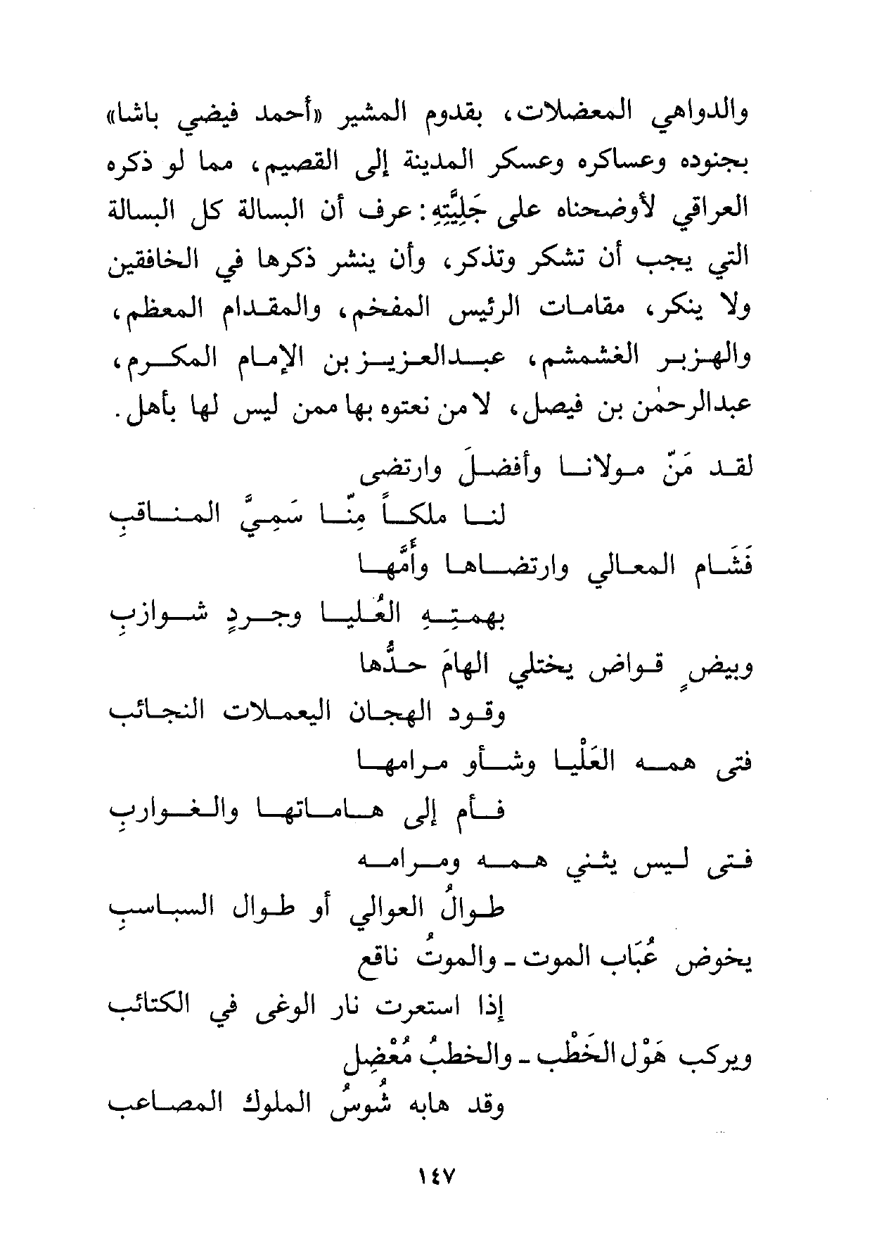 والدواهي المعضلات، بقدوم المشير "أحمد فيضي باشا" بجنوده وعساكره وعسكر المدينة إلى القصيم، مما لو ذكره العراقي لأوضحناه على جليته: عرف أن البسالة كل البسالة التي يجب أن تشكر وتذكر، وأن ينشر ذكرها في الخافقين ولا ينكر، مقامات الرئيس المفخم، والمقدام المعظم، والهزبر الغشمشم عبد العزيز بن الإمام المكرم عبد الرحمن بن فيصل، لا من نعتوه بها ممن ليس لها بأهل.