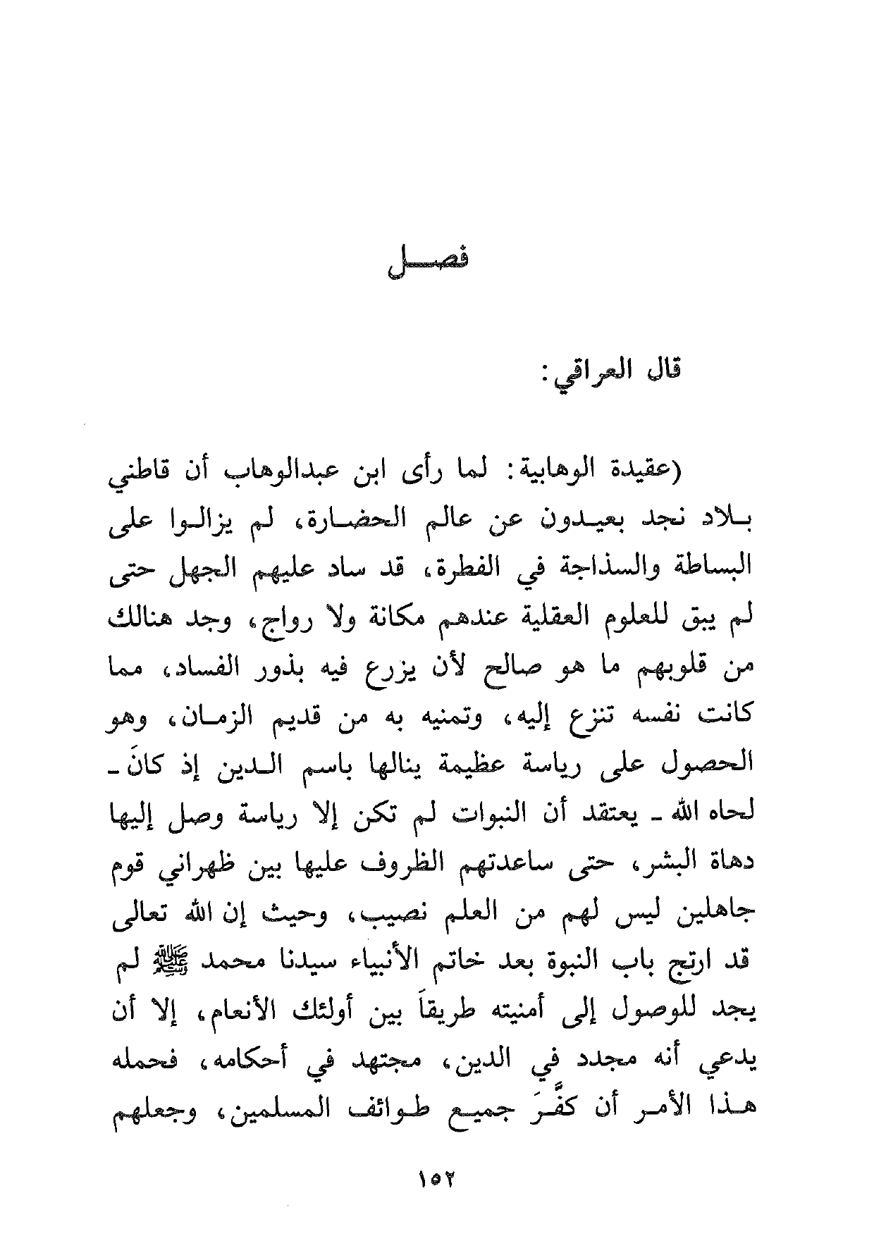 (عقيدة الوهابية: لما رأى ابن عبد الوهاب أن قاطني بلاد نجد بعيدون عن عالم الحضارة، لم يزلوا على البساطة والسذاجة في الفطرة، قد ساد عليهم الجهل حتى لم يبق للعلوم العقلية عندهم مكانة ولا رواج، وجد هنالك من قلوبهم ما هو صالح لأن يزرع فيه بذور الفساد، مما كانت نفسه تنزع إليه، وتمنيه به من قديم الزمان، وهو الحصول على رياسة عظيمة ينالها باسم الدين إذ كان –لحاه الله- يعتقد أن النبوات لم تكن إلا رياسة وصل إليها دهاة البشر، حتى ساعدتهم الظروف عليها بين ظهراني قوم جاهلين ليس لهم من العلم نصيب، وحيث إن الله تعالى قد ارتج باب النبوة بعد خاتم الأنبياء سيدنا محمد صلى الله عليه وسلم لم يجد للوصول إلى أمنيته طريقاً بين أولئك الأنعام، إلا أن يدعي أنه مجدد في الدين، مجتهد في أحكامه، فحمله هذا الأمر أن كفر جميع طوائف المسلمين، وجعلهم