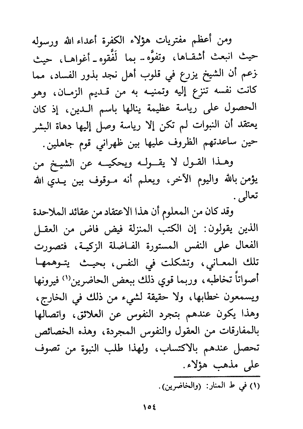 وقد كان من المعلوم أن هذا الاعتقاد من عقائد الملاحدة الذين يقولون: إن الكتب المنزلة فيض فاض من العقل الفعال على النفس المستورة الفاضلة الزكية، فتصورت تلك المعاني، وتشكلت في النفس بحيث يتوهمها أصواتا تخاطبه، وربما قوي ذلك ببعض الحاضرين1 فيرونها ويسمعون خطابها، ولا حقيقة لشيء من ذلك في الخارج، وهذا يكون عندهم بتجرد النفوس عن العلائق، واتصالها بالمفارقات من العقول والنفوس المجردة، وهذه الخصائص تحصل عندهم بالاكتساب، ولهذا طلب النبوة من تصوف على مذهب هؤلاء.