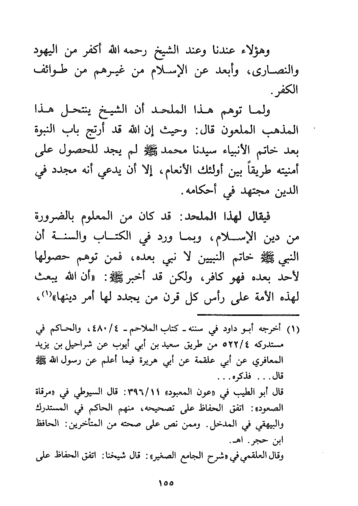 ولما توهم هذا الملحد أن الشيخ ينتحل هذا المذهب الملعون قال: وحيث إن الله قد أرتج باب النبوة بعد خاتم الأنبياء سيدنا محمد صلى الله عليه وسلم لم يجد للحصول على أمنيته طريقاً بين أولئك الأنعام، إلا ان يدعي أنه مجدد في الدين مجتهد في أحكامه.