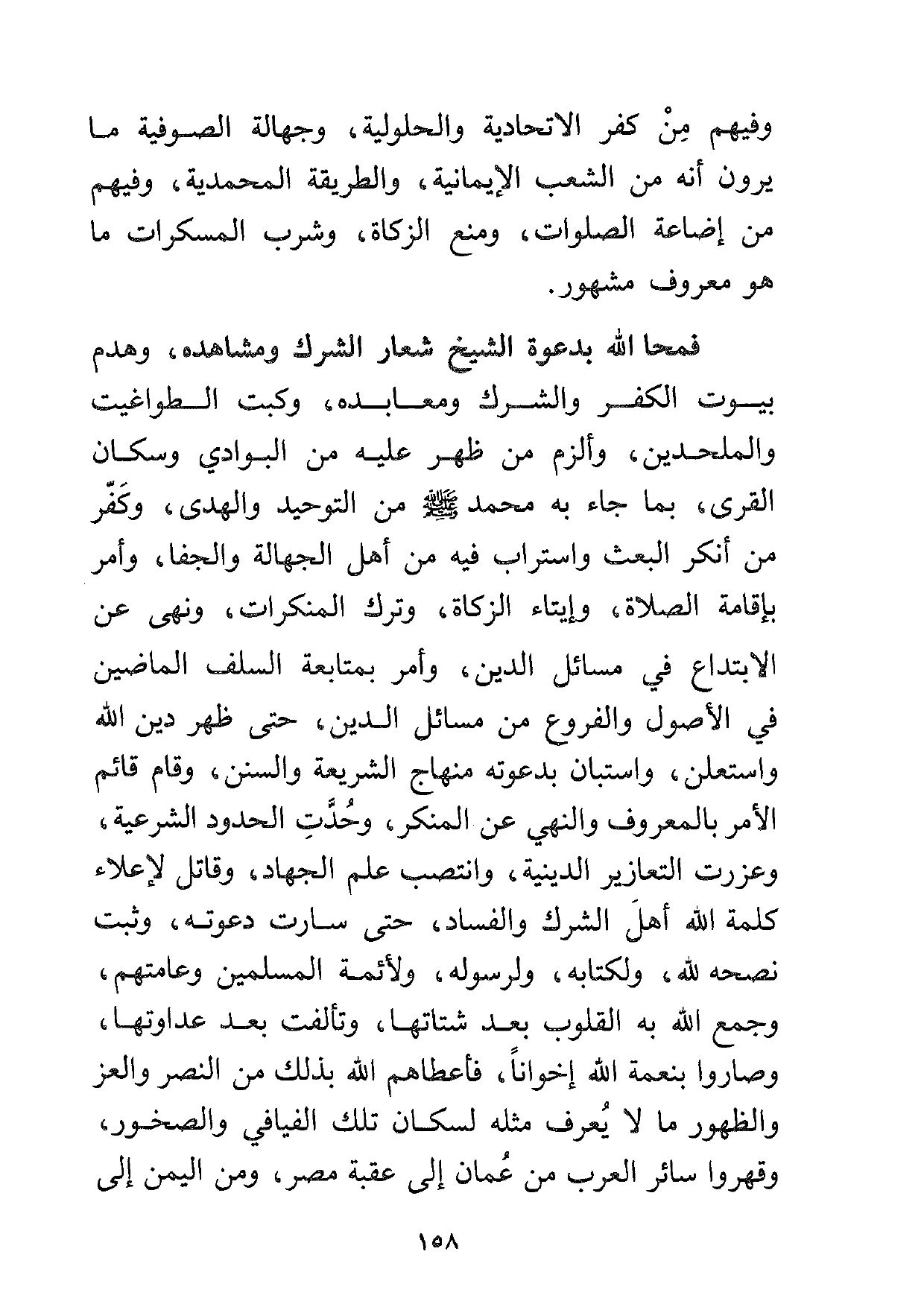 فمحا الله بدعوة الشيخ شعار الشرك ومشاهده، وهدم بيوت الكفر والشرك ومعابده، وكبت الطواغيت والملحدين، وألزم من ظهر عليه من البوادي وسكان القرى، بما جاء به محمد صلى الله عليه وسلم من التوحيد والهدى، وكفر من أنكر البعث واستراب فيه من أهل الجهالة والجفا، وأمر بإقامة الصلاة وإيتاء الزكاة، وترك المنكرات، ونهى عن الابتداع في مسائل الدين، وأمر بمتابعة السلف الماضين في الأصول والفروع من مسائل الدين، حتى ظهر دين الله واستعلن، واستبان بدعوته منهاج الشريعة والسنن، وقام قائم الأمر بالمعروف والنهي عن المنكر، وحدت الحدود الشرعية، وعزرت التعازير الدينية، وانتصب علم الجهاد، وقاتل لإعلاء كلمة الله أهل الشرك والفساد، حتى سارت دعوته وثبت نصحه لله ولكتابه ولرسوله، ولأئمة المسلمين وعامتهم، وجمع الله به القلوب بعد شتاتها، وتألفت بعد عداوتها، وصاروا بنعمة الله إخواناً، فأعطاهم الله بذلك من النصر والعز والظهور ما لا يعرف مثله لسكان تلك الفيافي والصخور، وقهروا سائر العرب من عمان إلى عقبة مصر، ومن اليمن إلى