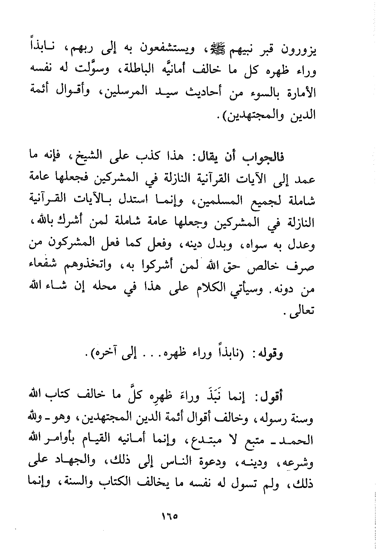 أقول: إنما نبذ وراء ظهره كل ما خالف كتاب الله وسنة رسوله، وخالف أقوال أئمة الدين المجتهدين، وهو –ولله الحمد- متبع لا مبتدع، وإنما أمانيه القيام بأوامر الله وشرعه ودينه، ودعوة الناس إلى ذلك، والجهاد على ذلك، ولم تسول له نفسه ما يخالف الكتاب والسنة، وإنما