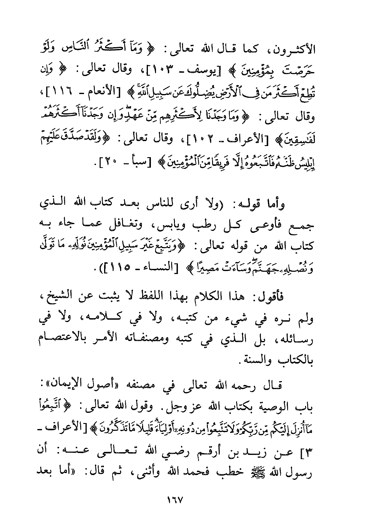 قال رحمه الله تعالى في مصنفه "أصول الإيمان": باب الوصية بكتاب الله عز وجل. وقول الله تعالى: {اتَّبِعُوا مَا أُنْزِلَ إِلَيْكُمْ مِنْ رَبِّكُمْ وَلا تَتَّبِعُوا مِنْ دُونِهِ أَوْلِيَاءَ قَلِيلاً مَا تَذَكَّرُونَ} [الأعراف:3] عن زيد بن أرقم رضي الله تعالى عنه: أن رسول الله صلى الله عليه وسلم خطب فحمد الله وأثنى، ثم قال: "أما بعد