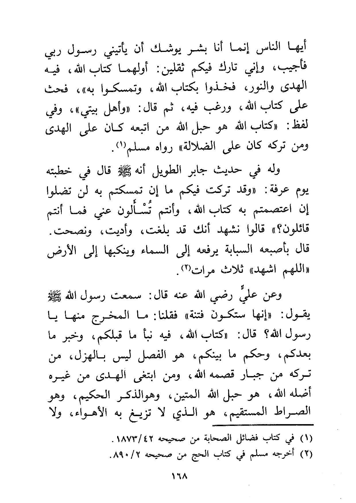 أيها الناس إنما أنا بشر يوشك أن يأتيني رسول ربي فأجيب، وإني تارك فيكم ثقلين: أولهما كتاب الله، فيه الهدى والنور، فخذوا بكتاب الله، وتمسكوا به"، فحث على كتاب الله، ورغب فيه، ثم قال: "وأهل بيتي"، وفي لفظ: "كتاب الله هو حبل الله ومن اتبعه كان على الهدى ومن تركه كان على الضلالة" رواه مسلم1.