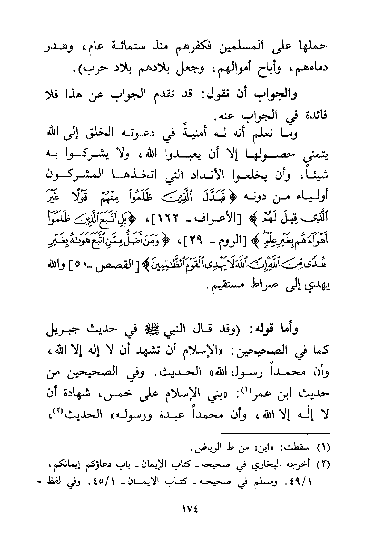 وأما قوله: (وقد قال النبي صلى الله عليه وسلم في حديث جبريل كما في الصحيحين: "الإسلام أن تشهد أن لا إله إلا الله، وأن محمداً رسول الله" الحديث. وفي الصحيحين من حديث ابن عمر1: "بني الإسلام على خمس، شهادة أن لا إله إلا الله، وأن محمداً عبده ورسوله" الحديث2،