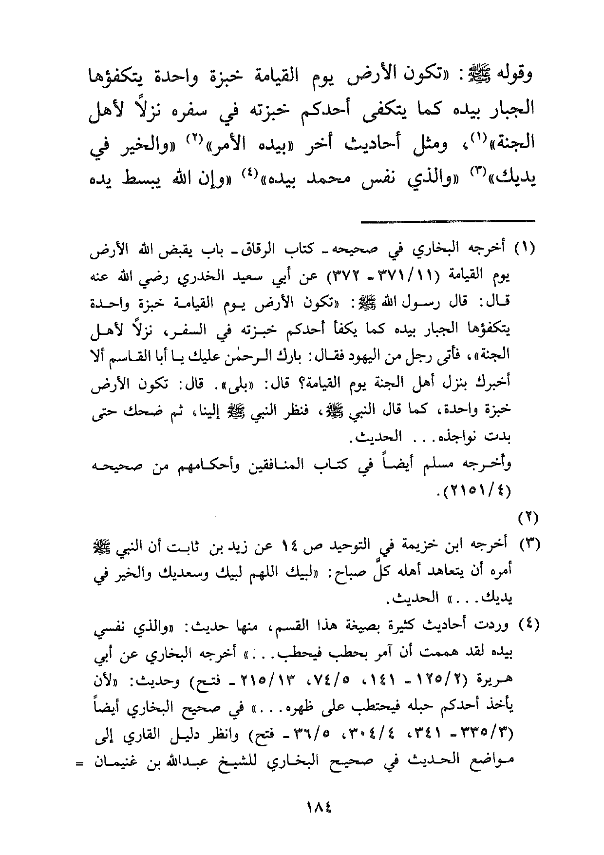 وقوله صلى الله عليه وسلم: "تكون الأرض يوم القيامة خبزة واحدة يتكفؤها الجبار بيده كما يتكفى أحدكم خبزته في سفره نزلاً لأهل الجنة" 1، ومثل أحاديث أخر "بيده الأمر"2، "والخير في يديك" 3، "والذي نفس محمد بيده" 4، "وإن الله يبسط يده
